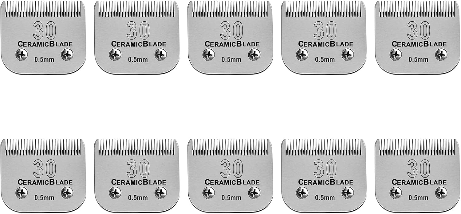 10 Pack Detachable Pet Dog Clipper Blades, Compatible with Andis Size 30 Cut Length 1/50"(0.5mm),Most Oster A5,Wahl KM10 Series Clippers,Made of Ceramic Blade & Stainless Steel Blade
