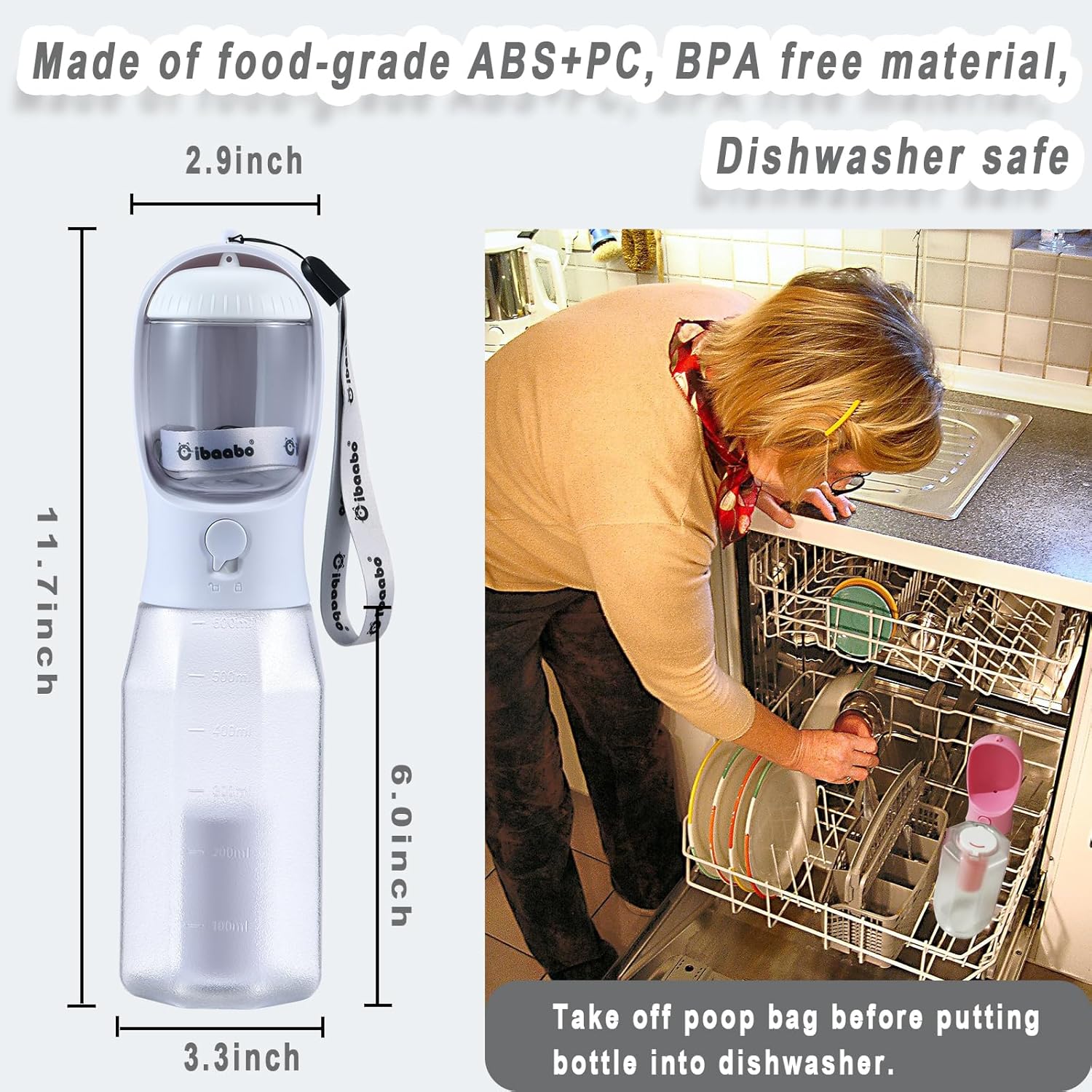 - Safe and Heat Resistant Material & Widely Uses: The dog water bottle is made of food grade ABS+PC, BPA free material. 250℉/121℃ affordable and dishwasher safe. It’s suitable for walking, travelling, picnic, camping, hiking, training with your pets