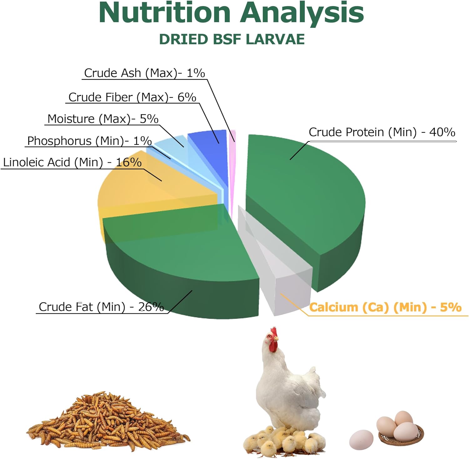 - Calcium-Rich Nutrition: Dried Black Soldier Fly Larvae offer an abundance of calcium, surpassing dried mealworms by 85 times, promoting robust eggshell strength and supporting healthy growth in poultry.