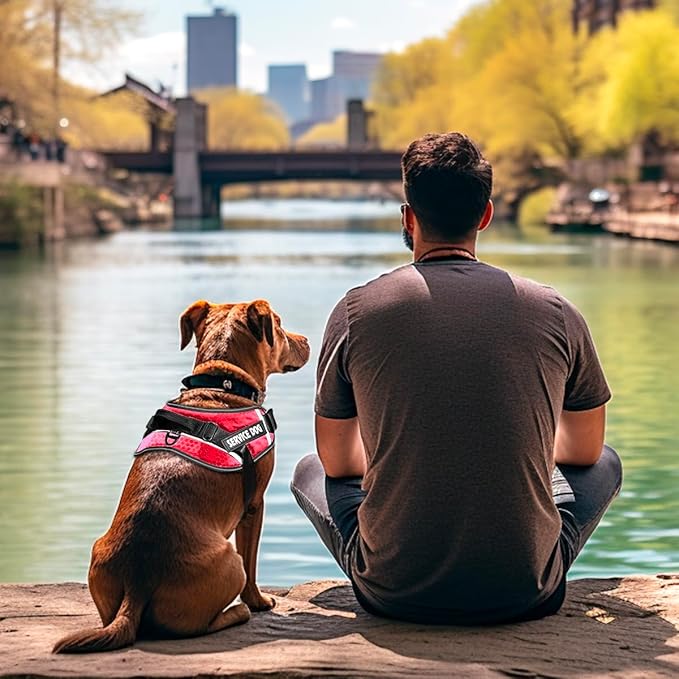 - Built to Last:No-pull service dog vest made of high quality durable nylon material and sponge pads.Sturdy fabric handle on the back,easy control for your pet dogs outdoor sports.The service dog harness come with adjustable neck and chest strap with 2 strong release buckle.Easily adjust neck and chest to fit your dog perfectly.Service dog vest come with a 5ft nylon dog leash with soft padded handle.