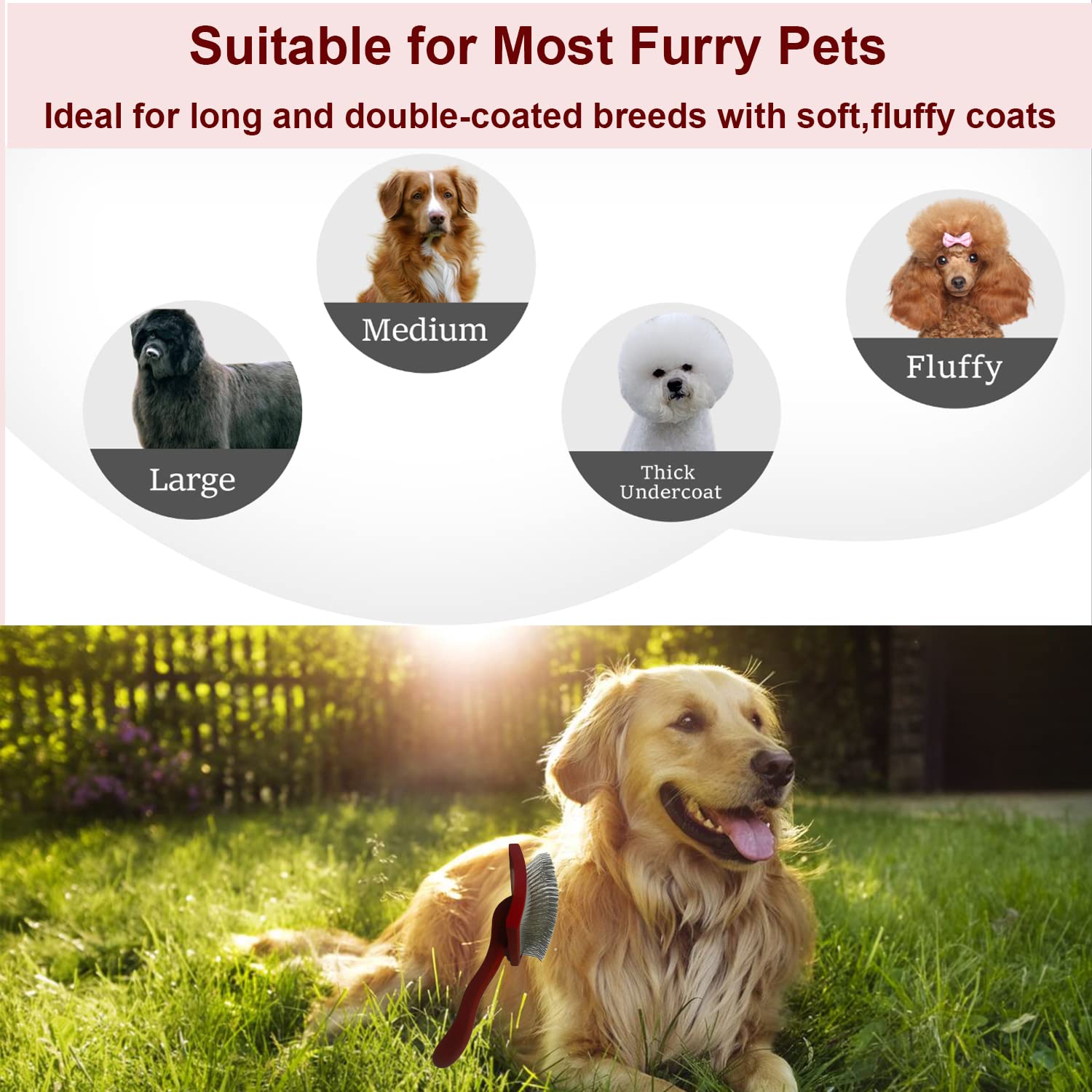 - Curved Face and Long Pins: Curved panel dog slicker brush for goldendoodles poodles, extra long stainless (1 inch )steel pins slicker brush offers more contact area of long haired pets,friendly to the natural roundness of your pets' bodies, the cat neck, flanks, back and sides. Removing up to 95% of dead hair and tangles from your pet easily just within minutes! Keep your furniture and floors free of pet hair