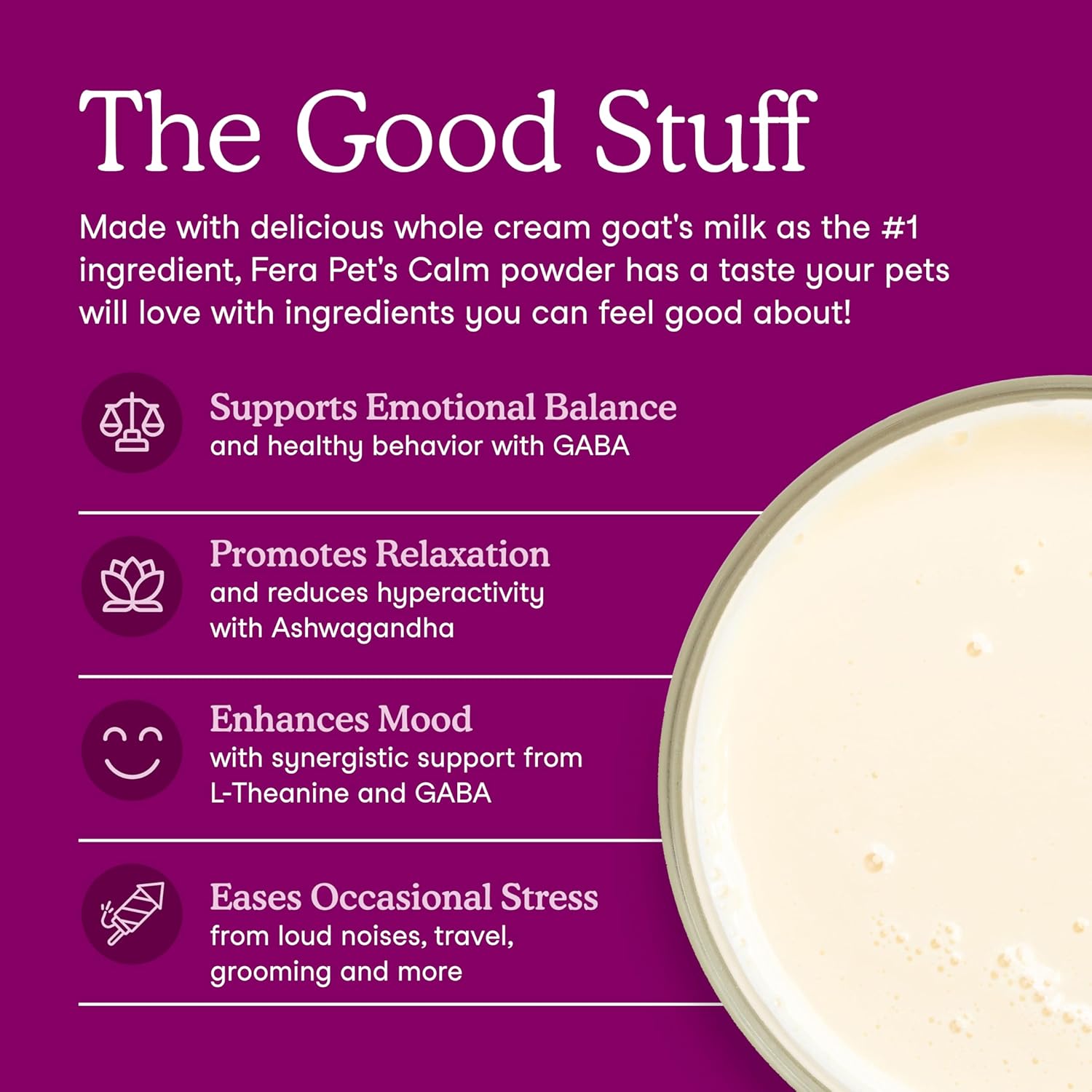 - Easy pet relaxation: Fera’s dog and cat Calming goat milk topper is a powerful mix of botanicals like ashwagandha, and neurotransmitters for an overall balanced mood