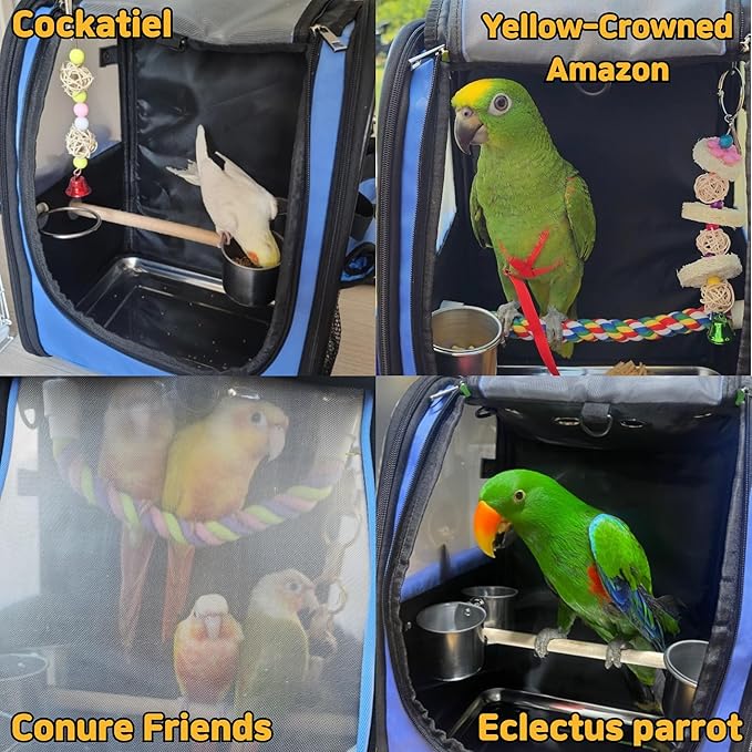 - 🎁【What's Included】 1 Bird Backpack + 1 Stainless Steel Tray + 1 Wooden Perch + 1 Rope Perch + 1 Feeding Cup + 1 Shoulder Strap + 1 Carrying Case