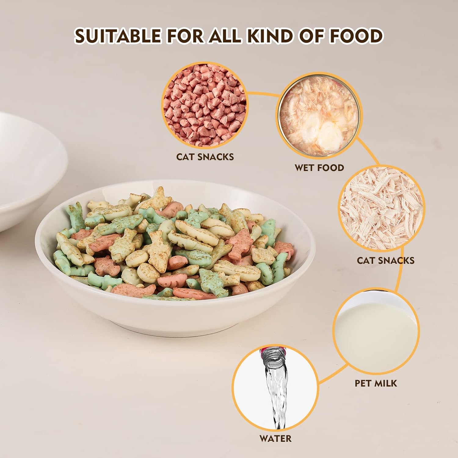 - Multipurpose - Come in 6 pieces, allowing you to feed multiple cats at the same time. This cat bowl set is perfect for serving dry food, wet food, raw food, canned food, water, pet milk and cat treats. And the 8.5 oz cat food plate is great for portion control.