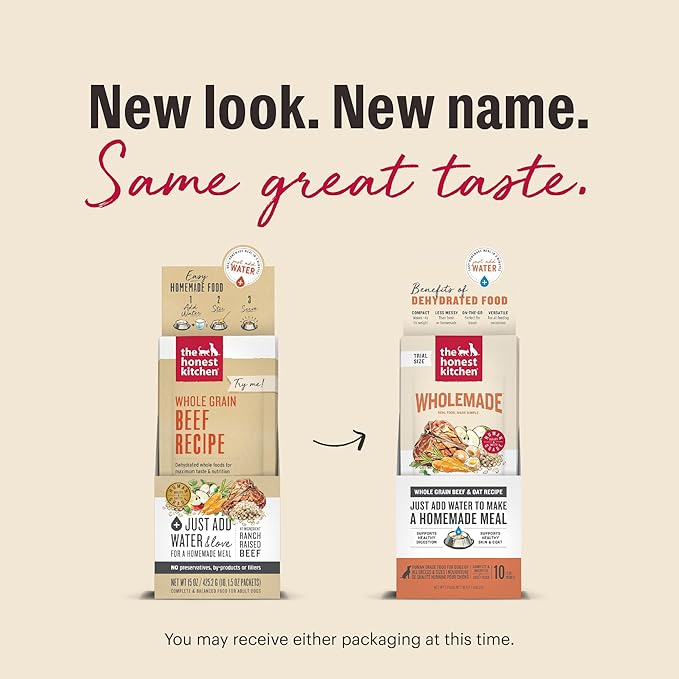 - COMPLETE NUTRITION FOR ADULT AND SENIOR DOGS: The Honest Kitchen Dehydrated Whole Grain Beef Dog Food offers balanced nutrition made from ranch-raised beef, oats, and carrots to support the health of dogs of all breeds and sizes.