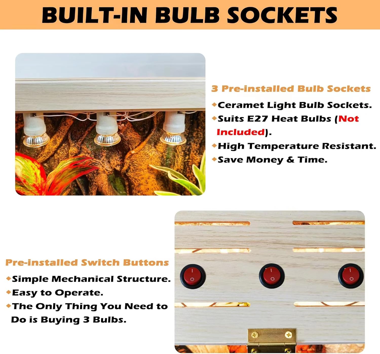 - 【Built-in Bulb Sockets】Featuring two built-in bulb sockets (three in the 40&48-inch version) compatible with E27 heat bulbs, night lights, and more (bulbs not included). Easily set up your lighting for the perfect reptile habitat.
