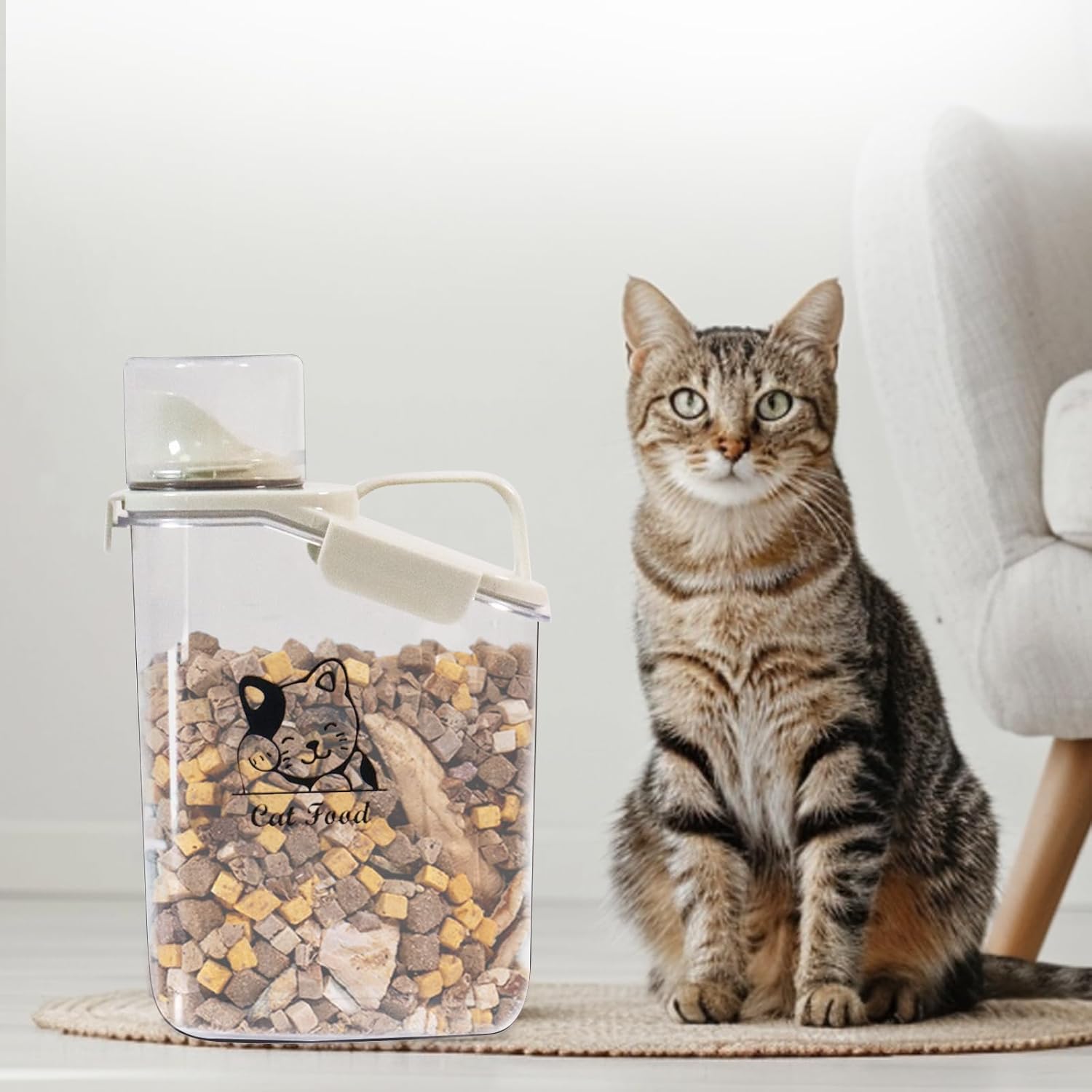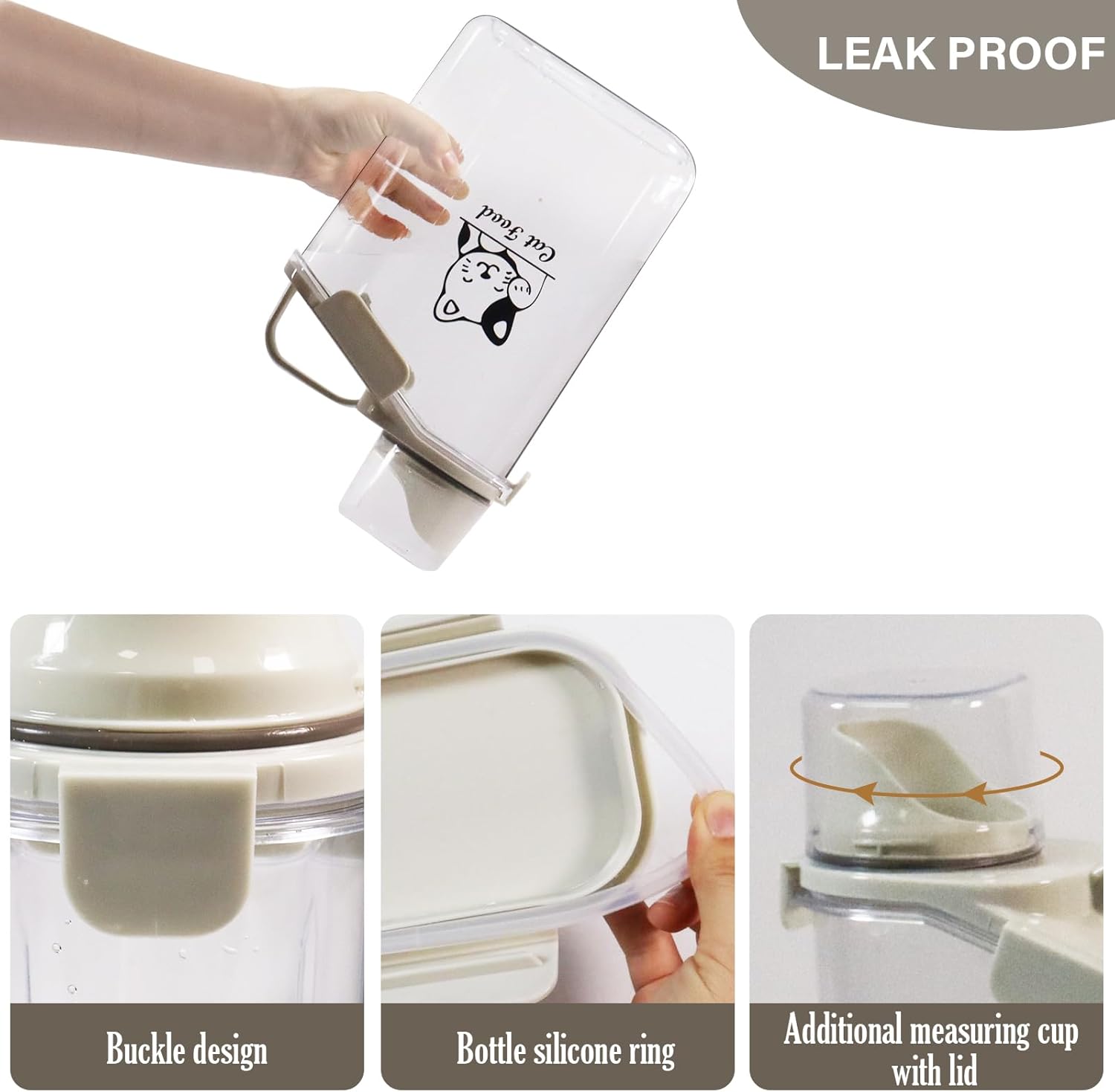 - 1.MULTI FUNCTION PET FOOD STORAGE: Keeps your pet food fresh and protected from water vapor in this airtight cat food bin.Completing with pour spout design,this cat biscuit bin will enhance your space and make every pouring fast and neat.There's even a measuring cup making it easier for feeding times as well.