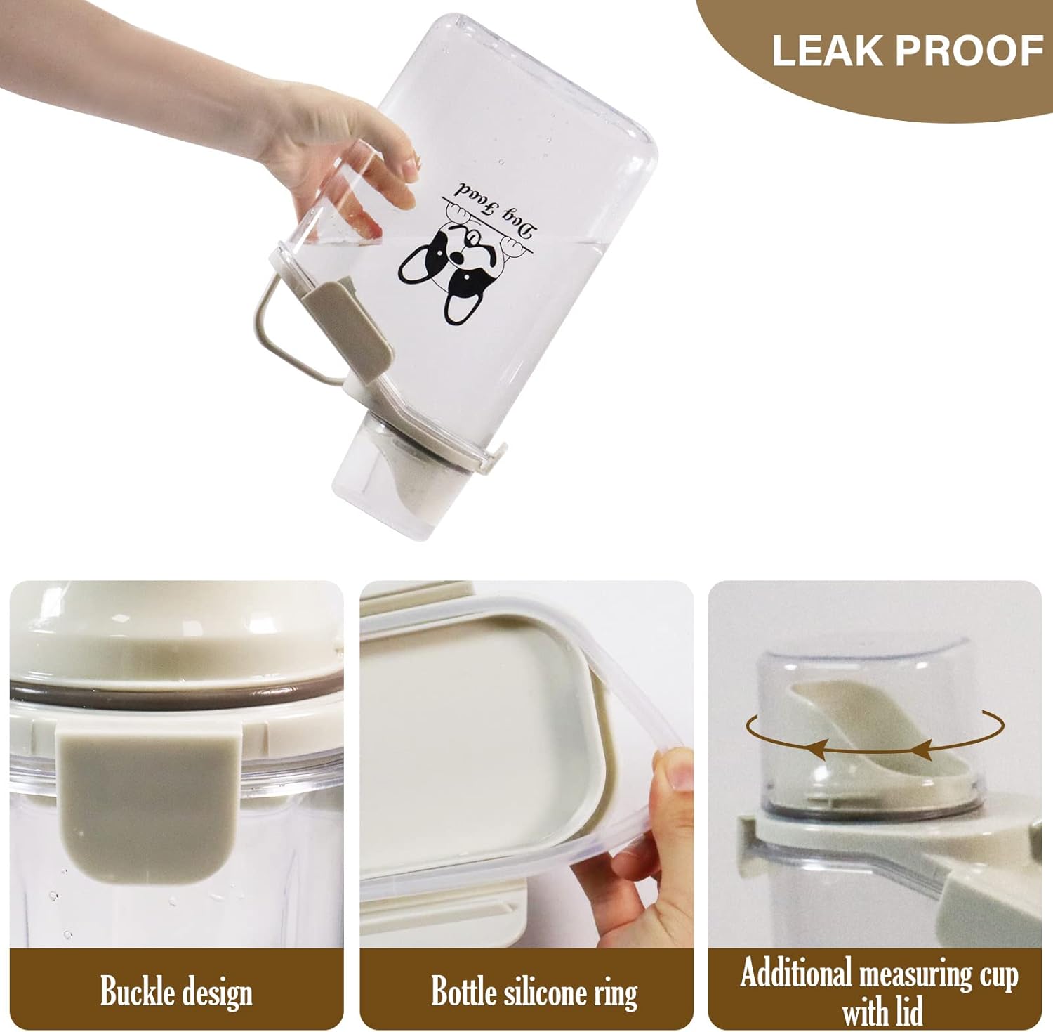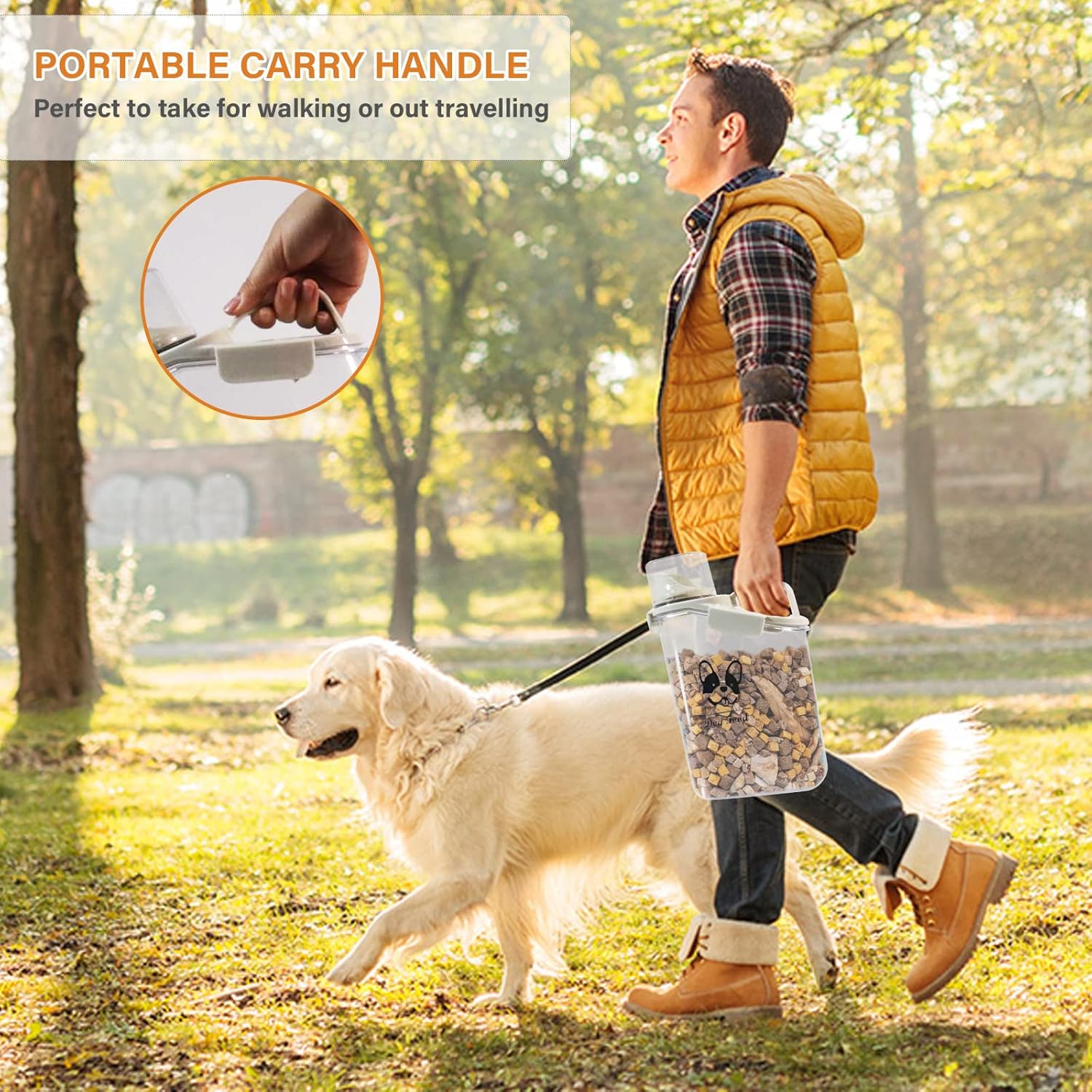 - 2.Dog food travel container :Measuring 17.7L*7.8W*25H CM and holds up to 2-3 lbs of your dog's favorite dry food.Lightweight,portable shape and handle with enough capacity,this pet food storage bucket is ideal for walking, camping or short travel.
