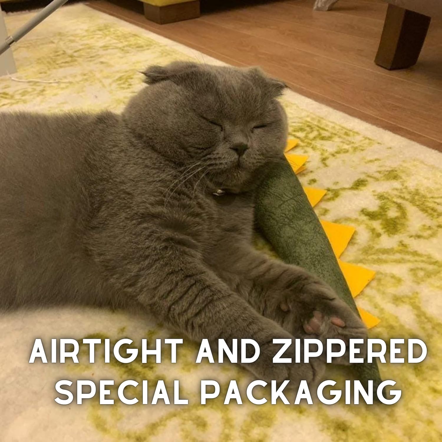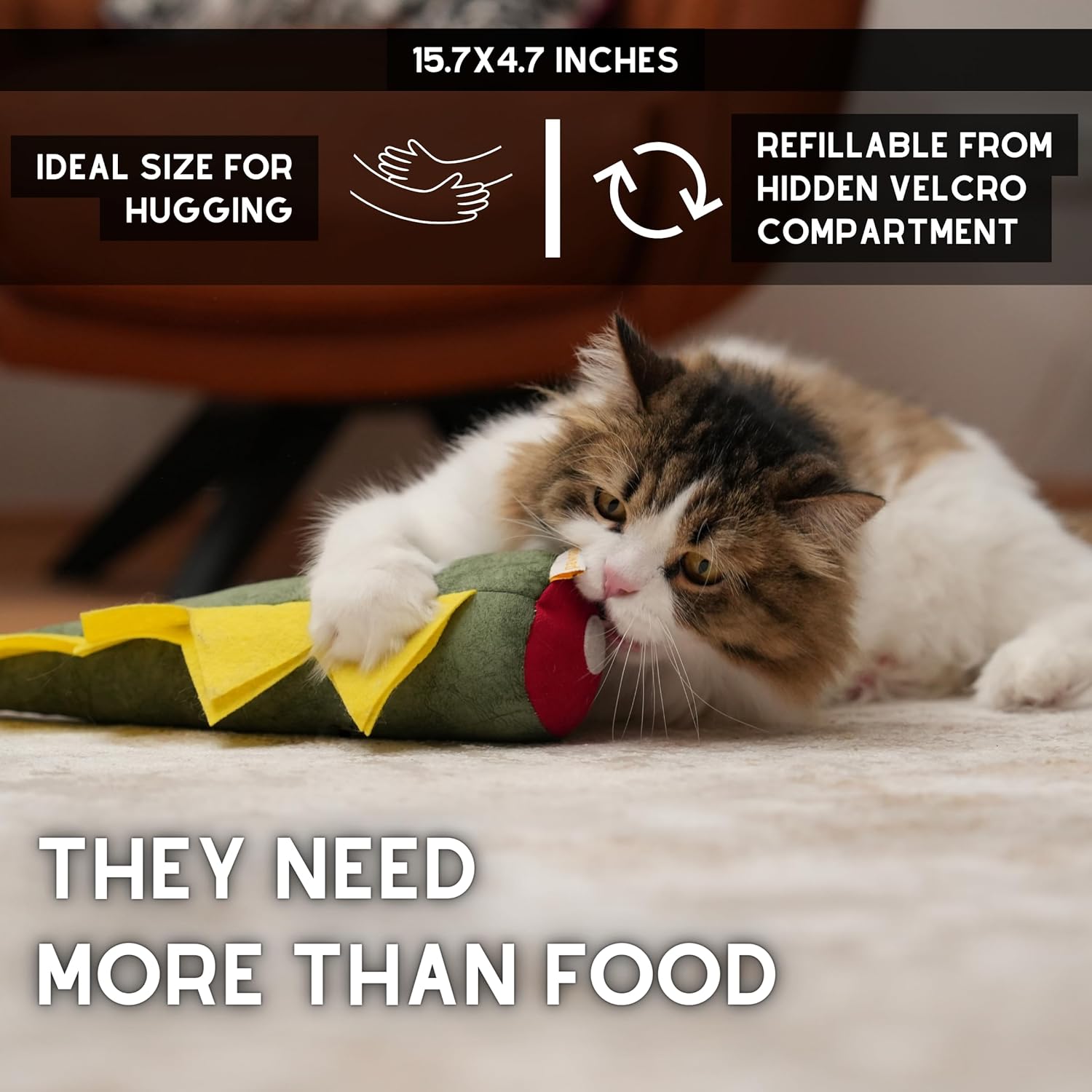 - ๐จโโ๏ธ VETERINARY DOCTOR APPROVED: On DINO, from the filling materials inside to the types of fabric used outside, each one was selected by the veterinarian, considering the most suitable products for cats. The catnip matatabi silvervine in our large cat enrichment toy helps relieve stress.