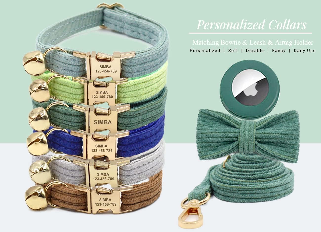 - Custom options include matching bow ties, leashes, and AirTag holders to choose from.