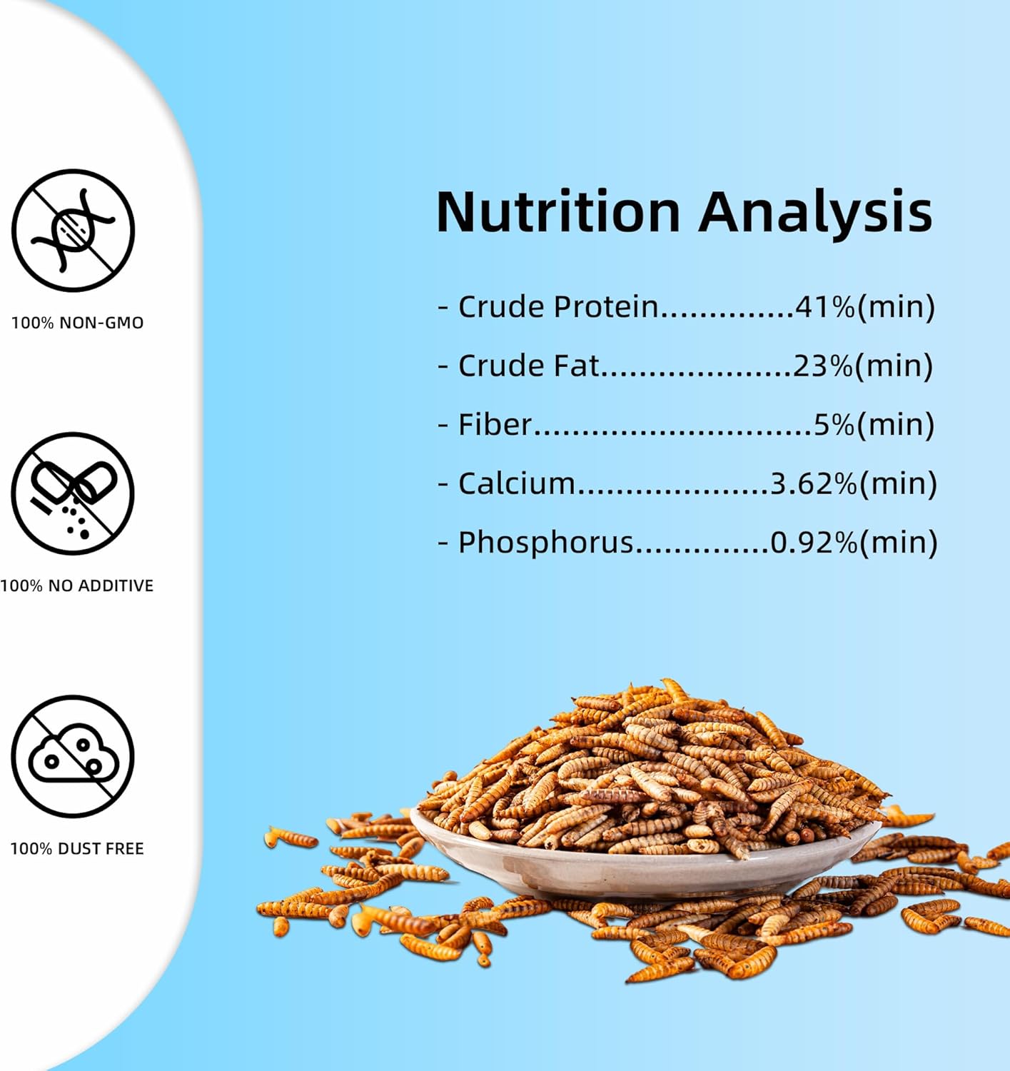 - Black Soldier Fly Larvae is rich in calcium, it’s contain at least 85x more calcium than dried mealworms and with over 41% protein, this high protein treats allows your chickens to eat healthier, lay bigger eggs and produce more, the best chicken treats for laying hens