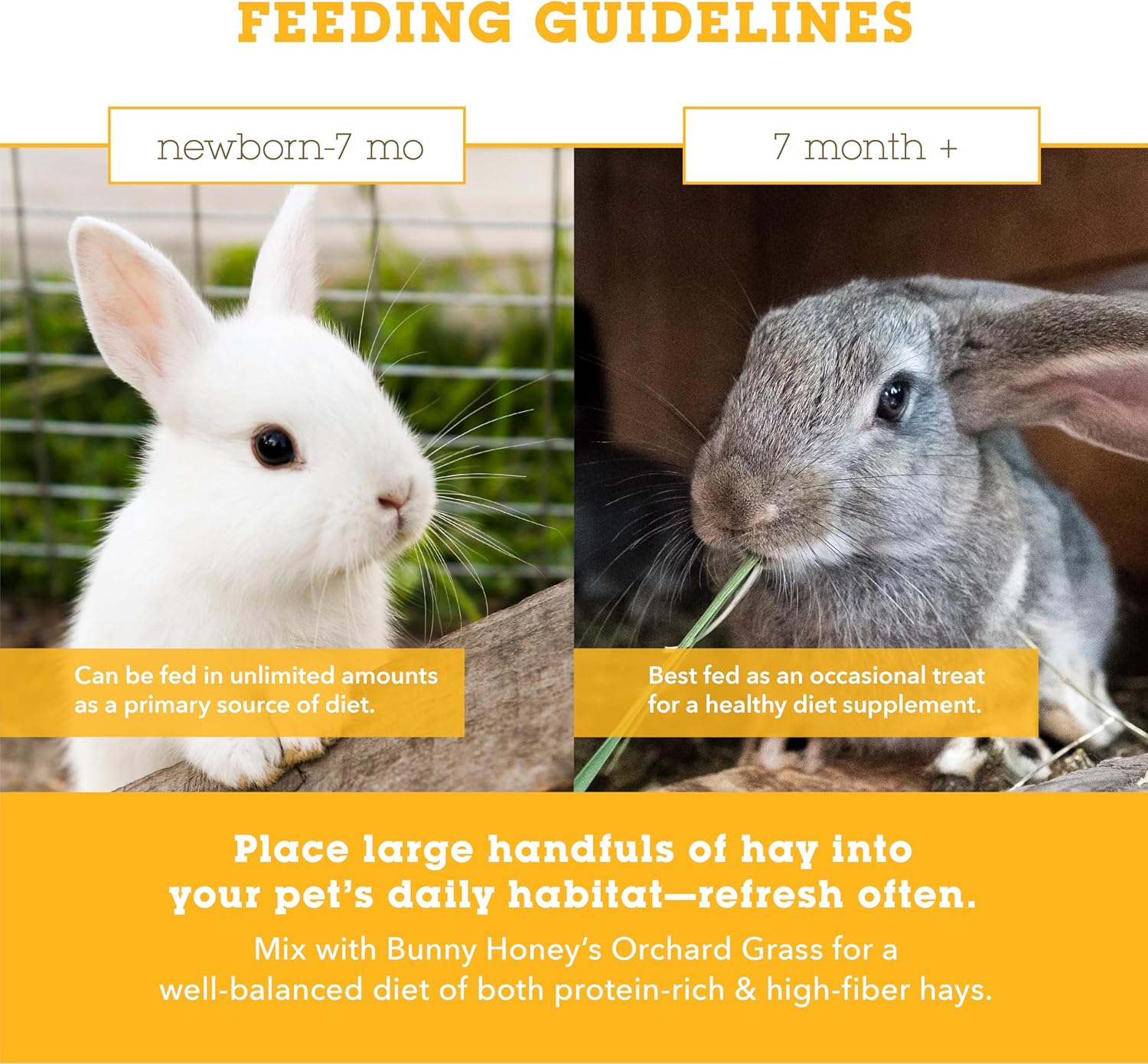 - Great for young Pets: Good smell, good taste, and no blend of nutrition make it an ideal guinea pig food and perfect hay for rabbits, chinchillas, chickens, ferrets, and more small animals. Best suited for animals younger than 7 months. While it can't be the main diet for older pets, it can still be fed as an occasional treat for adult pets, including rabbits.