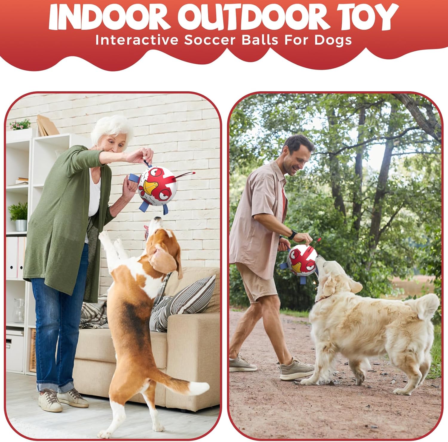 - Interactive Dog Ball with Straps: Dog soccer ball with straps sewn evenly into the seams not only create an erratic bounce that your dogs love to chase, but also make it easier for your dogs to fetch, toss, tug and retrieve. There's a longer strap for you to hold the ball,making it a great interactive dog toy to train your dogs
