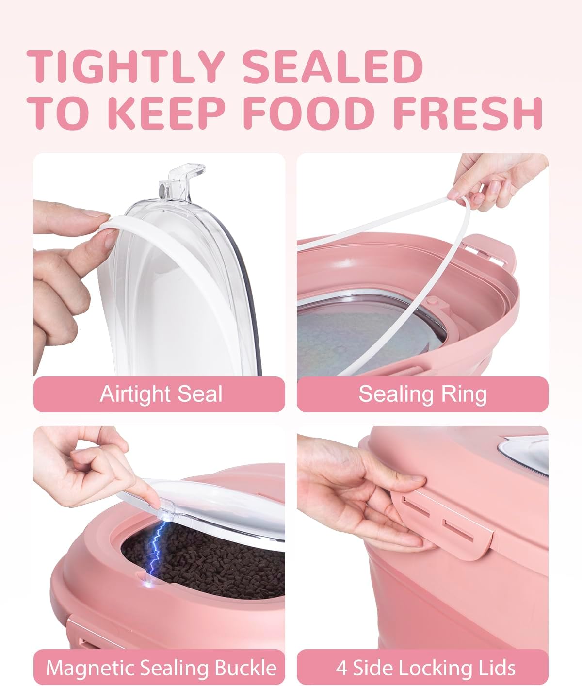 30-35 Lbs Dog Food Storage Container Collapsible Dog Food Container with Airtight Lids, Wheels, Scoop and 2pcs Food Storage Containers, Large Pet food storage for Dog, Cat (Pink)