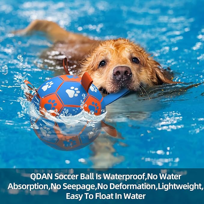 - QDAN Dog Soccer Ball Best Git For Your Dog - Send your dog a bithday gift. House and Outdoor Dog Toyscan be played in the llving room,pool.lake and beach,because it ls also Water Toys Bal,no water absorption.noseepage,no deformation,lightweight,easy to float in water. Dog Soccer Ball with Grab straps are great for dog catching