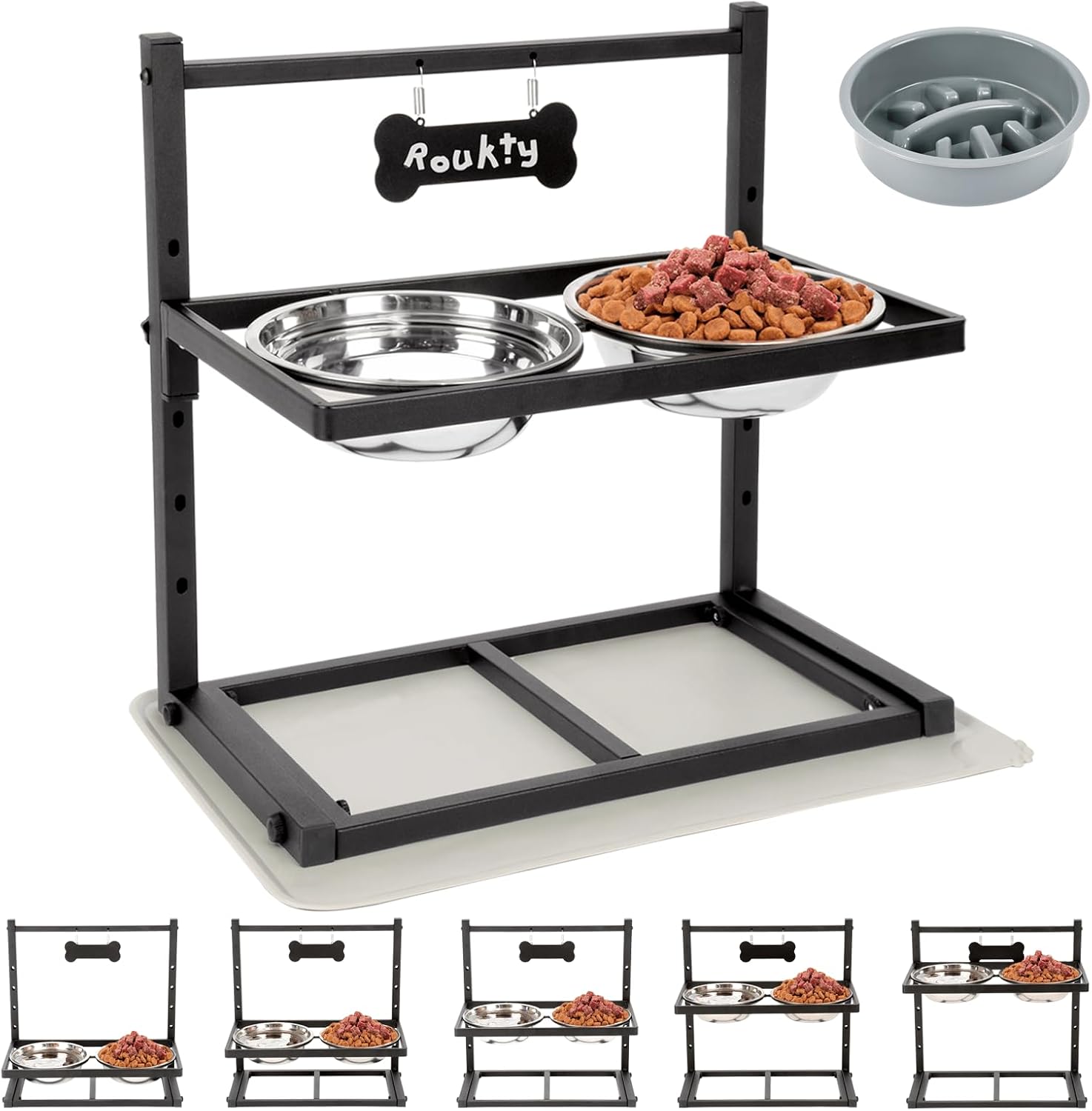 Elevated Dog Bowls with Slow Feeder, 5 Adjustable Heights, Anti-Slip, Durable Metal Frame, Spill Proof Mat, Rust-Resistant Bowls, Easy to Clean