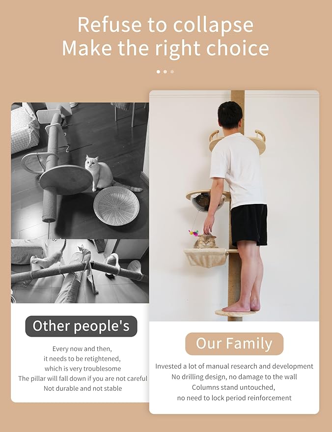 - For tall cat trees, stability is crucial: the thickened catback base, 加粗 (thickened) sisal-wrapped scratching posts, and 3 top fixtures work together to ensure the tree's stability. A total of 8 sisal scratching posts allow for flexible assembly, with heights sufficient to fit most household interiors.