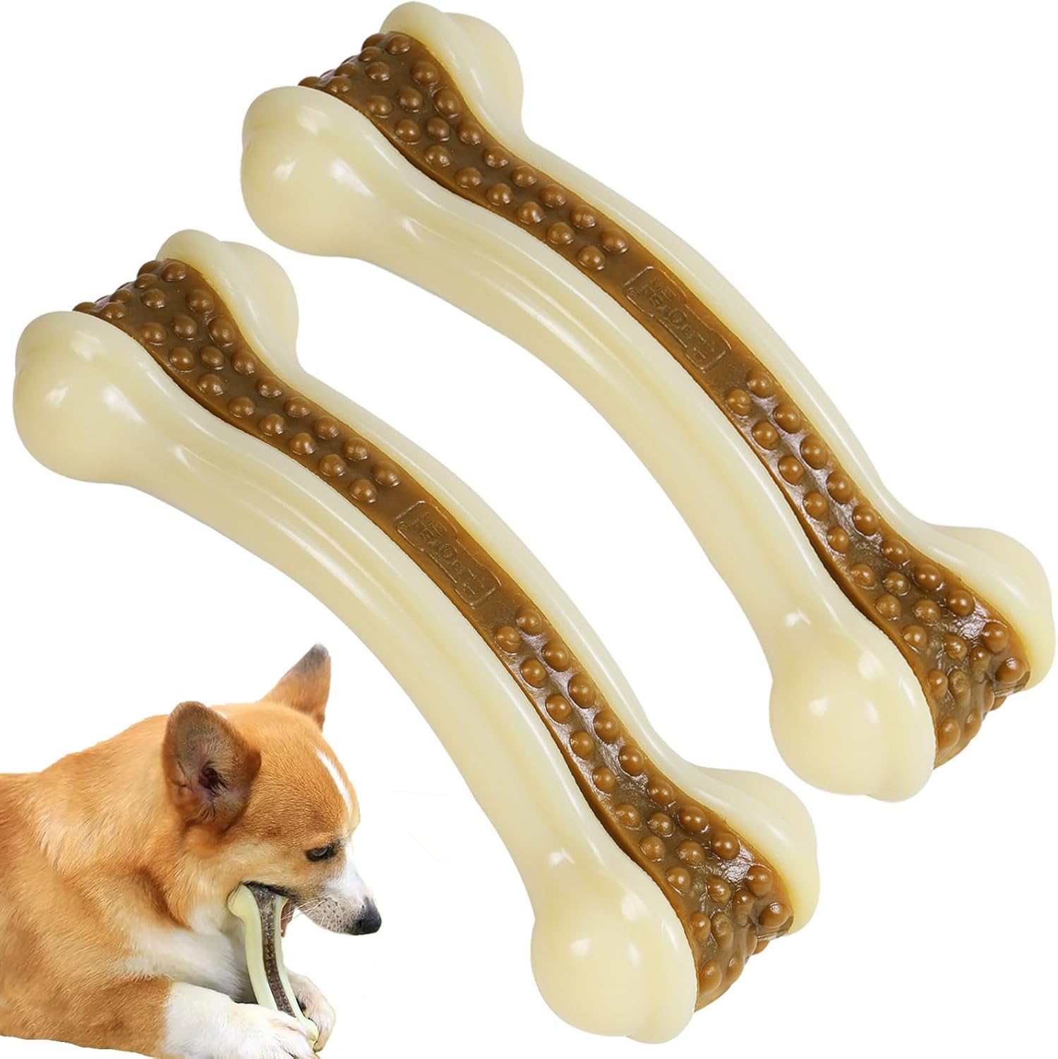 Dog Chew Toys for Aggressive Chewers, 2 Pack Beef Flavor Tough Dog Bones for Large/Medium Breed Dogs, Nylon Dog Toys for Teething and Training