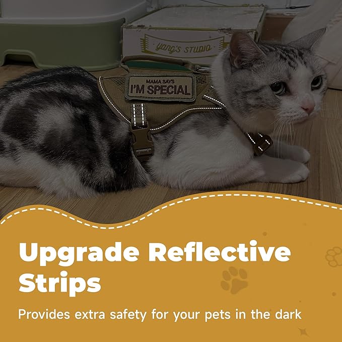 Tactical Cat Harness Adjustable Soft Padded Training Walking Esacpe Cat Vest Harness No-Pull Pet Harness Reflective with Easy Control Handle (Khaki, XL)