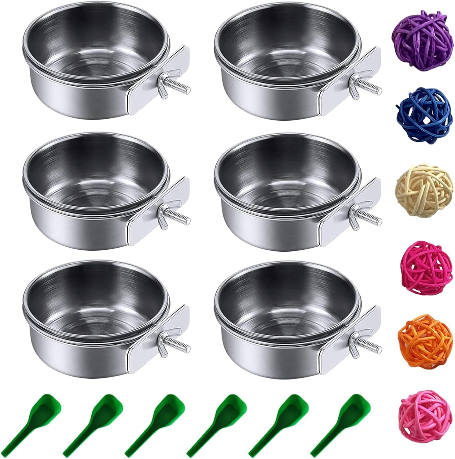 PINVNBY 6 Pieces Stainless Steel Bird Feeding Dish Cups,Parrot Feeder Parakeet Food Water Bowls with Clamp Holder & 6 Pcs Bird Spoon & 6 Pcs Birds Ball Toys for Budgies Macaw Small Animal(S)