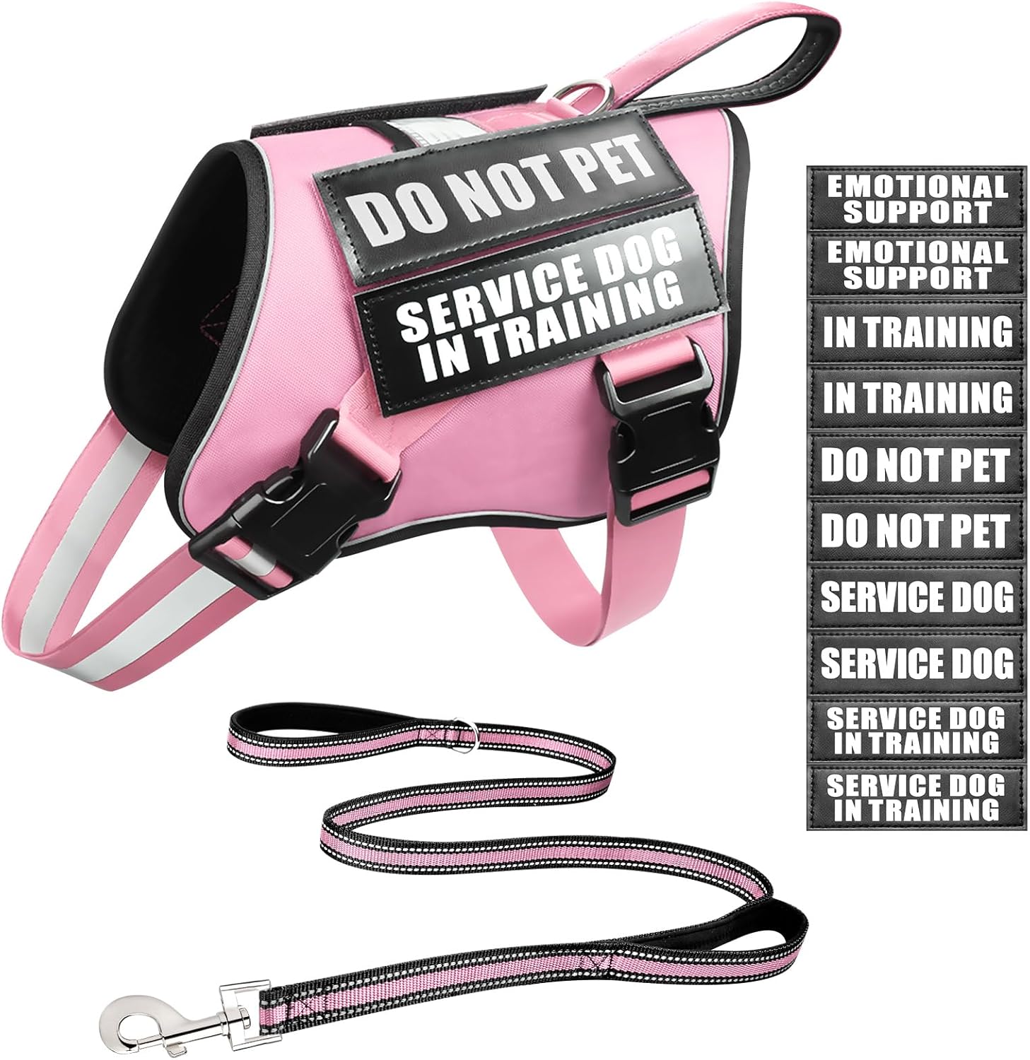 Service Dog Vest Harness and Leash Set+10 Patches,No Pull&Easy Walk Reflective Dog Harness with Soft Padded Handle for Training/Everyday,Fit Small/Medium/Large/Extra-Large Dogs(Pink S)