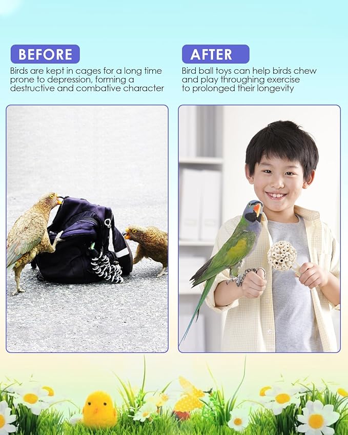 - Great Companion for Birds: The spherical shape of our products makes it easier for parrots to roll and chase them. Our product comes with a fruit fork, please fix them on the edge of the cage as needed for easily attract the attention of parrots to play