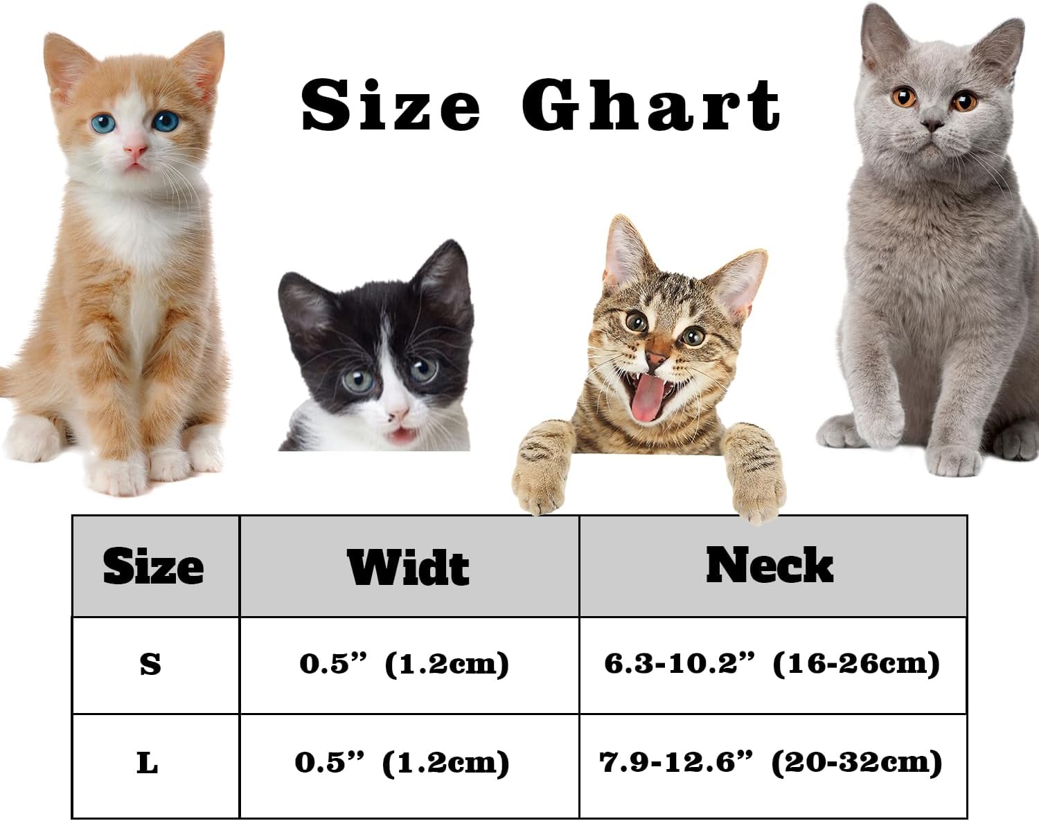- Adjustable Cat Collar: The collar can be manually adjusted in length, fits most cats. Manual measurement exisits 0.5"-1" error.S: 6.3''-10.2'' and L : 7.9''-12.6''.Please measure your cat's neck or current collar before ordering.