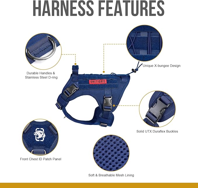 - MOLLE System & Military Style: Each side features two MOLLE straps as well as hoop & loop strips panel to easily attach molle pouches or ID panels; OneTigris harness is not designed to bear heavy weights and we advise against relying solely on the grab handle to carry your dog