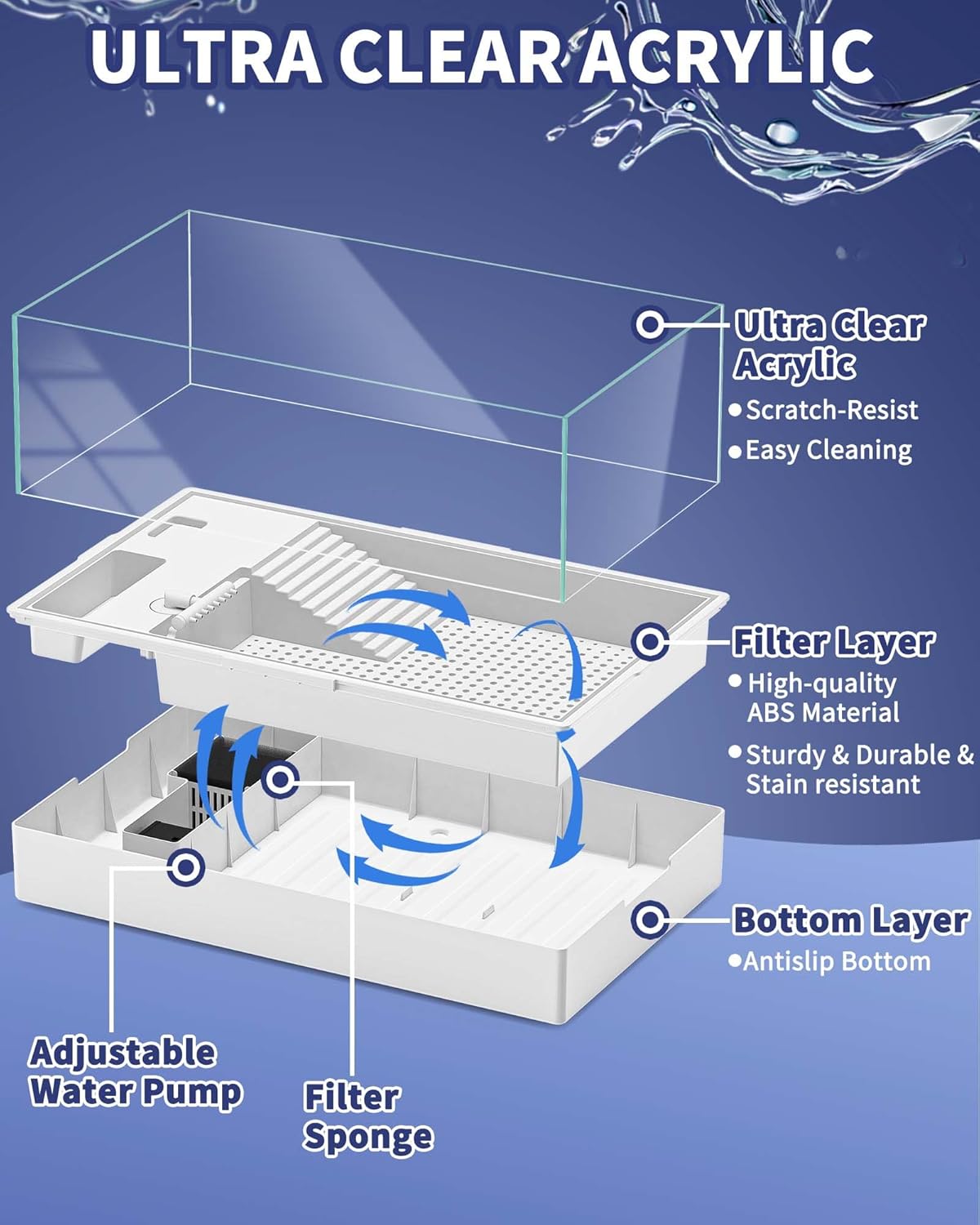 - 【Easy to Clean and Change Water】Our turtle tank is designed with two-layer separation, easy to clean and change water! Don't need to disassemble acrylic fence, just lift the upper layer, pour out dirty water and add clean water. Allow your turtles stay put and won't be disturbed at all.