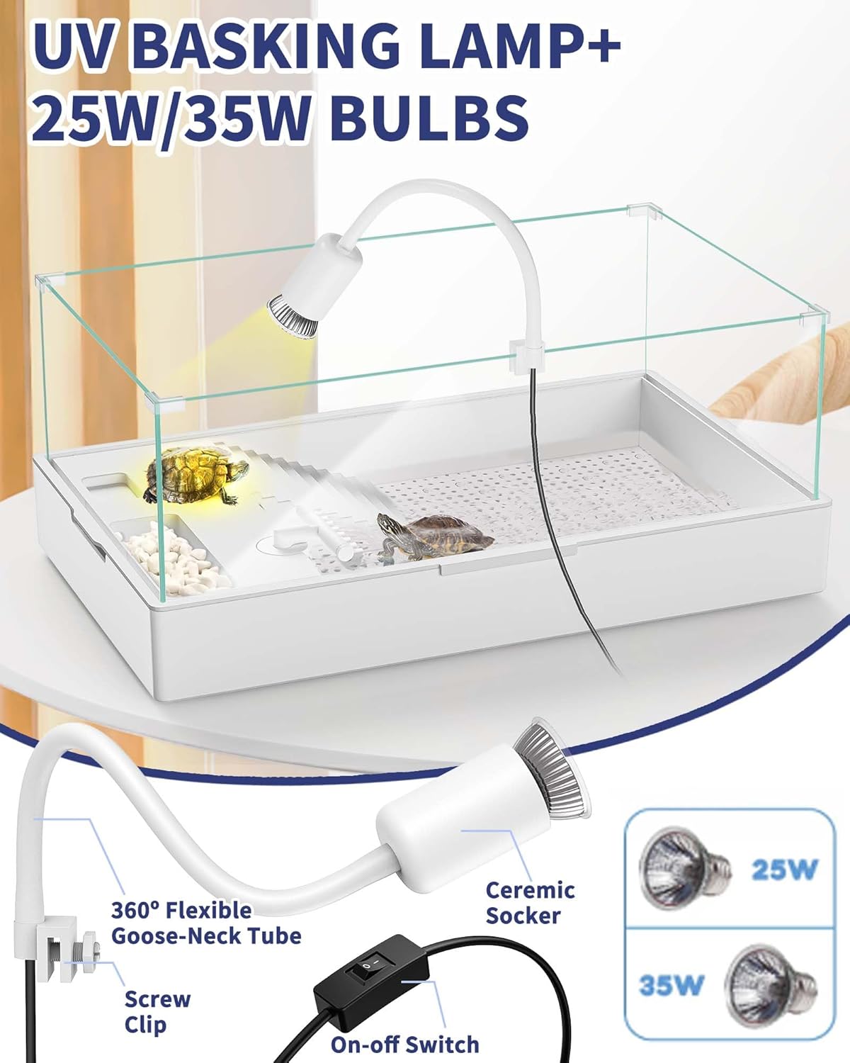 - 【360° Rotated Lamp with 25W & 35W Bulbs】 Our turtle habitat kit providing your pet a healthy environment, turtles need light and heat to thrive indoors. The light has UVA/UVB light that simulate sunlight, UVA can promote appetite, and UVB can promote calcium absorption by reptiles. Our reptile lamp fixture can be rotated 360° in any direction, tightly clipped on edge of tank's acrylic fences, the basking bulb provides the light turtles need.