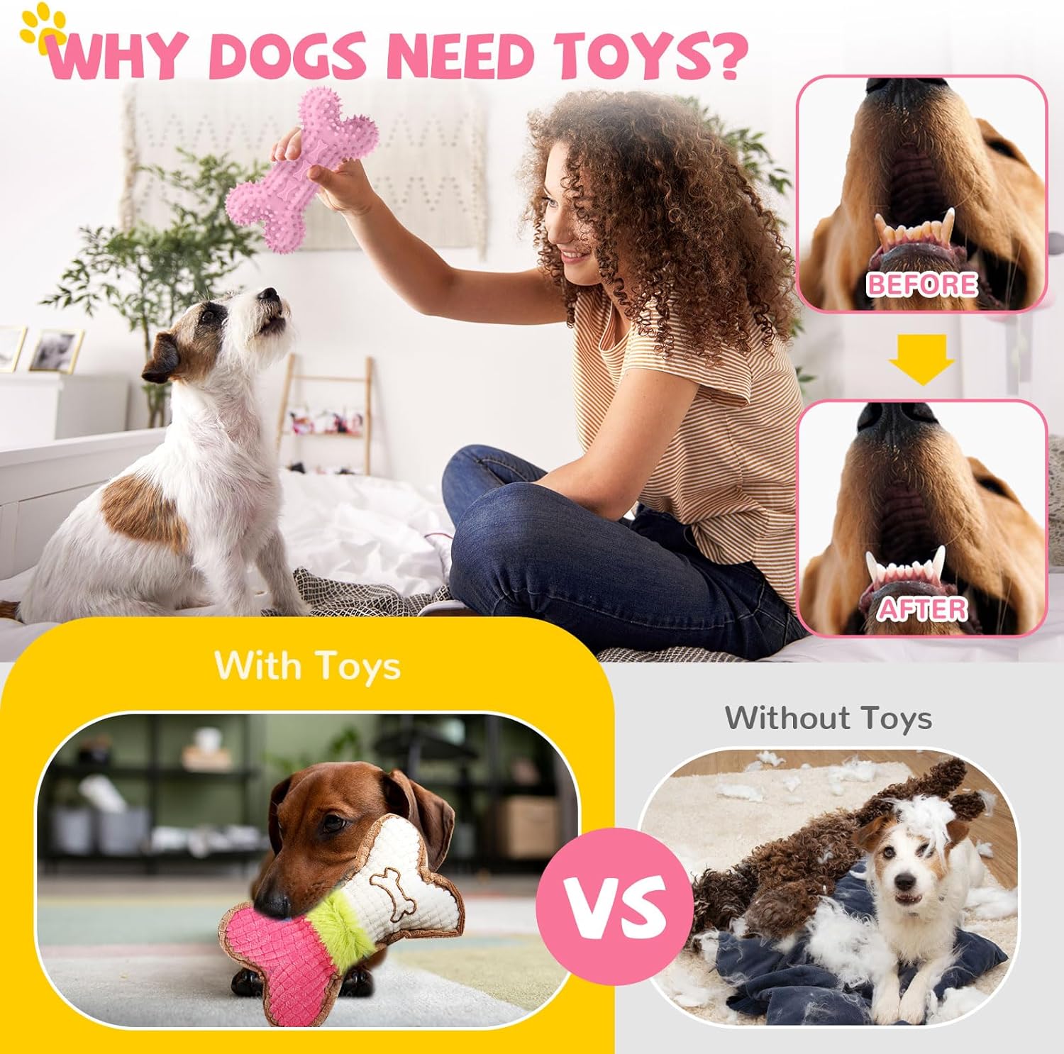 - 6 Pack Dog Toys for Small Dogs:These Interactive dog toys for small dogs contains 1 pink bone dog chew toy,3 pieces pink dog rope toys and 2 pieces pink stuffed plush dog toys(bone and ice cream shape).This dog toys set is suitable for dogs with a teething period of 0-8 months