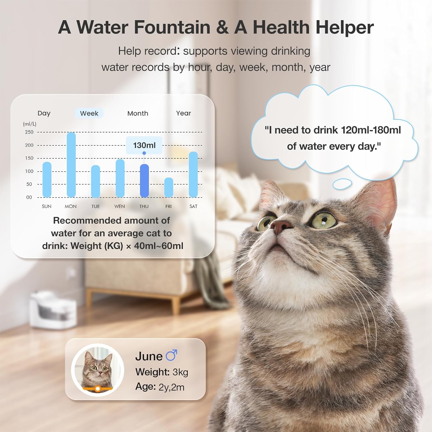 - Smart APP Health Monitoring: Monitor the real-time drinking data of cat water fountains for drinking(accurate to grams),recording of daily/weekly/monthly/yearly drinking water data, promptly detect any abnormal water intake in your pet for health monitoring.Share the app account with your family to involve them in your pet's life! Note:Only supports 2.4G WiFi!