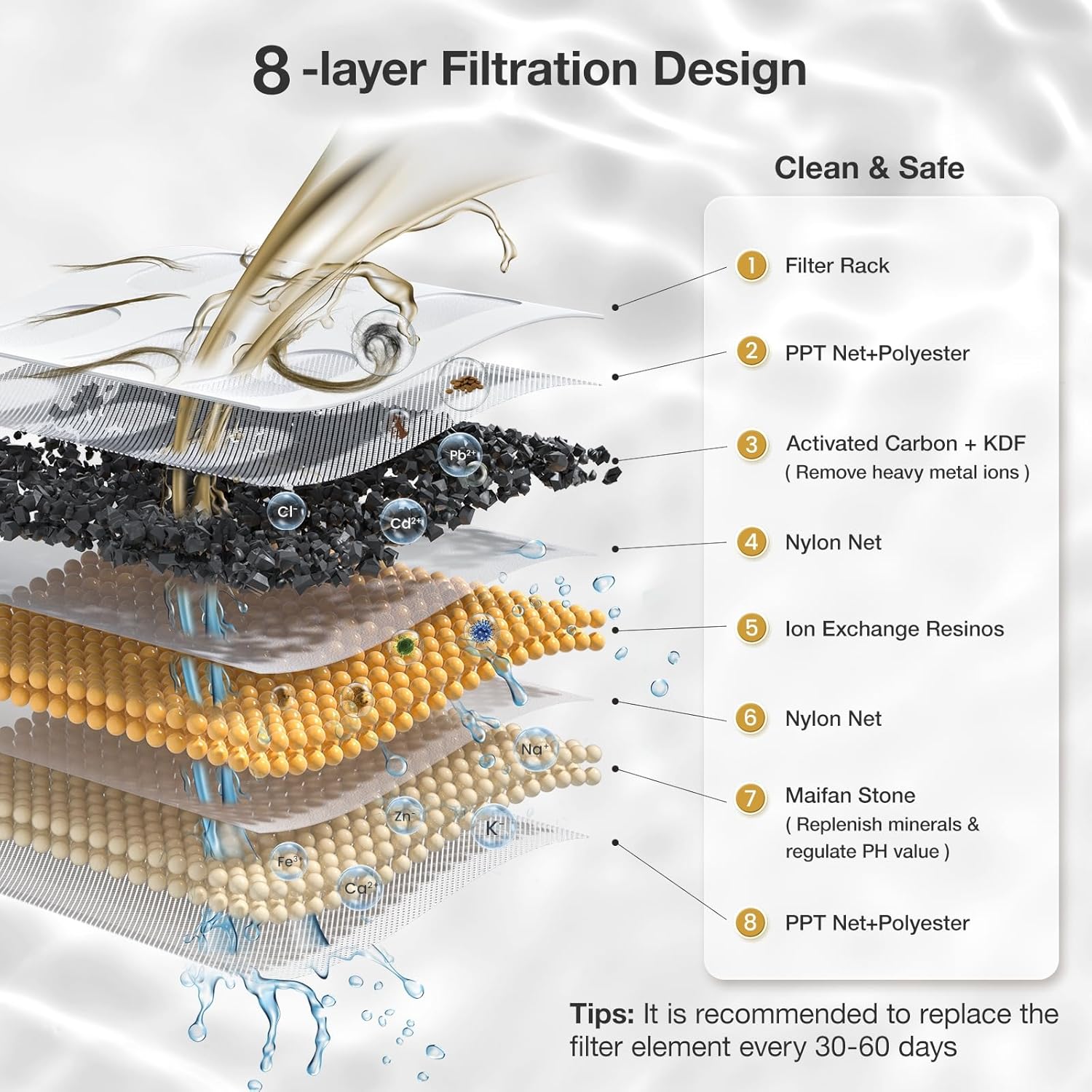 - Efficient 8-Layer Filtration: Our pet water fountain uses advanced filtration with activated carbon, ion exchange resin, mineral ceramic balls, and unique KDF materials. This efficiently removes impurities, softens water, and eliminates odors. The app shows the filter cartridge lifespan