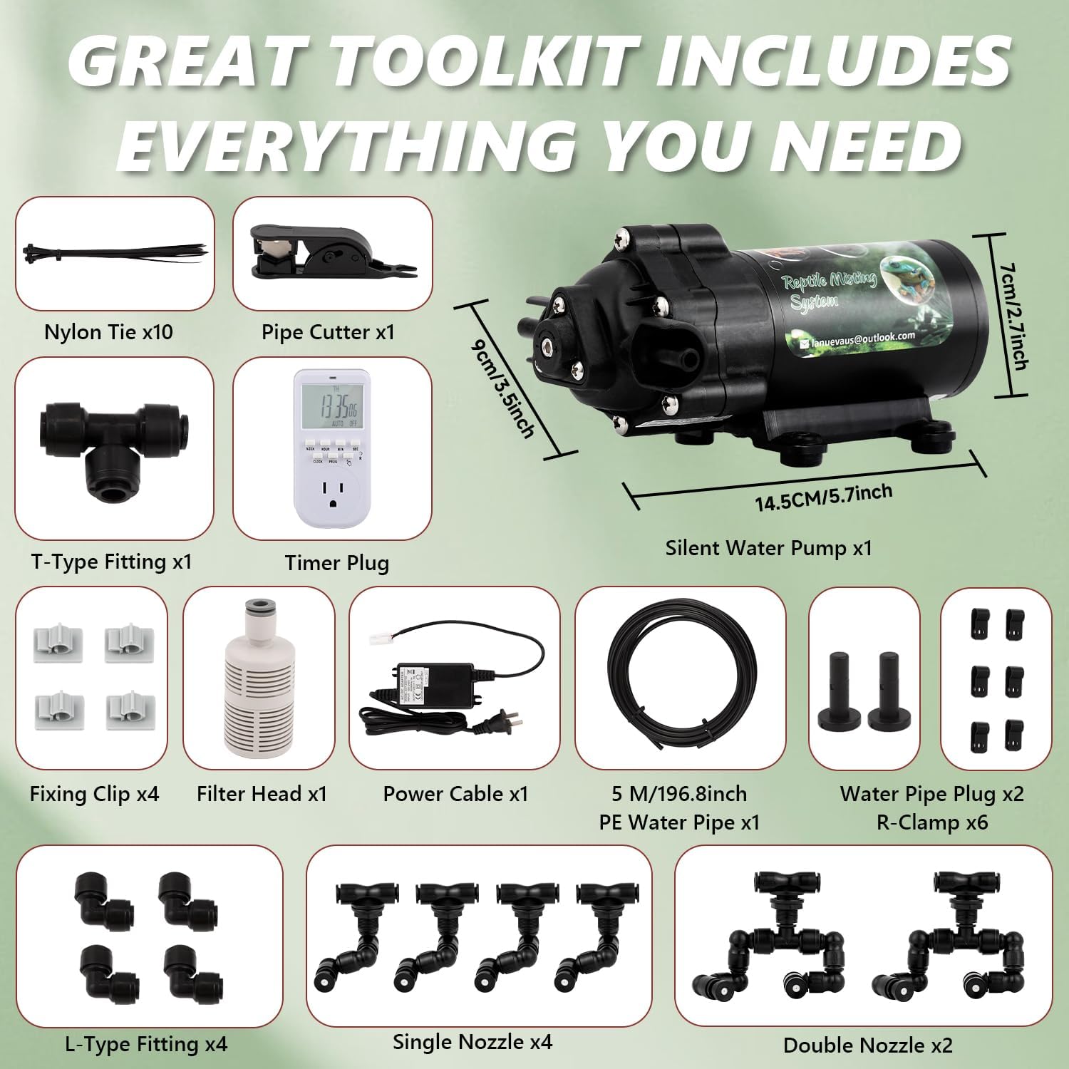 - EASY TO ASSEMBLE The kit offers all accessories you need: silent water pump*1, single nozzles*4, double nozzles *2, filter head *1, 5 meters water pipes *1, nylon ties *10, fixing clip*4, water pipe plug *2, R-clamp *6, etc. The installation is comprehensible and can be completed within 10 minutes by following the instructions. This quiet and automatic misting system is a great addition to any reptile enthusiast’s toolkit.