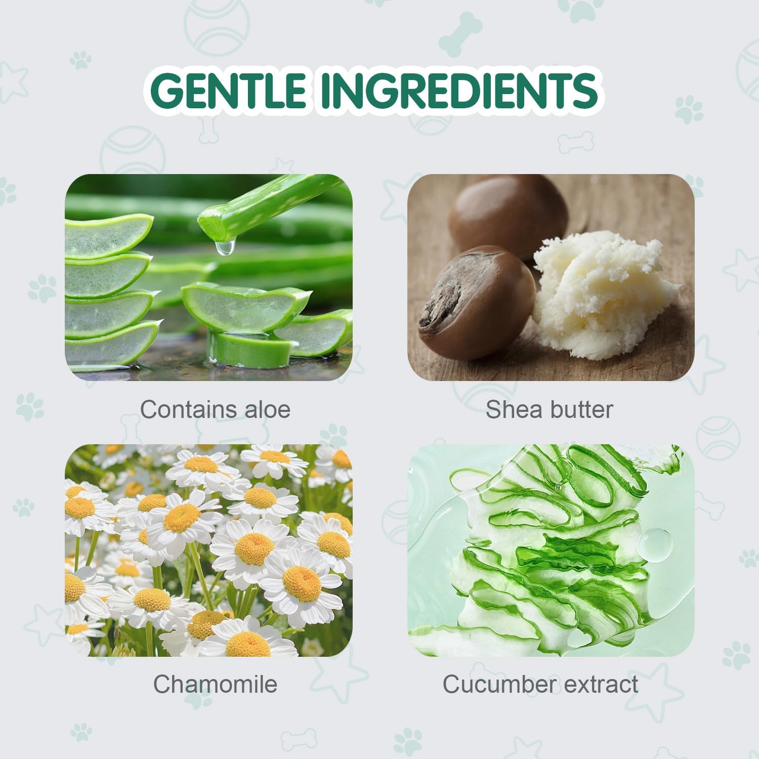 - GENTLE INGREDIENTS: Contains aloe, shea butter, chamomile and cucumber extract, helping clean, refresh and condition while giving the coat a healthy shine. Perfect for wiping away odor, dirt and dander from paws, body and bottom between baths.
