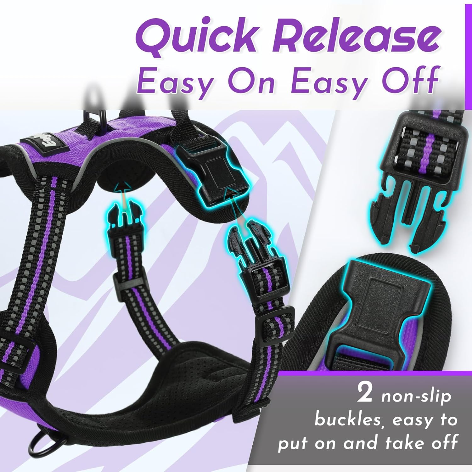 - Easy to Use: Our dog harness is designed with 2 quick-snap buckles for simple wearing and 4 adjustable sliders at the neck and chest for a perfect fit. Just slip it over your dog's head, buckle it up, adjust the straps, and you're ready to go in seconds