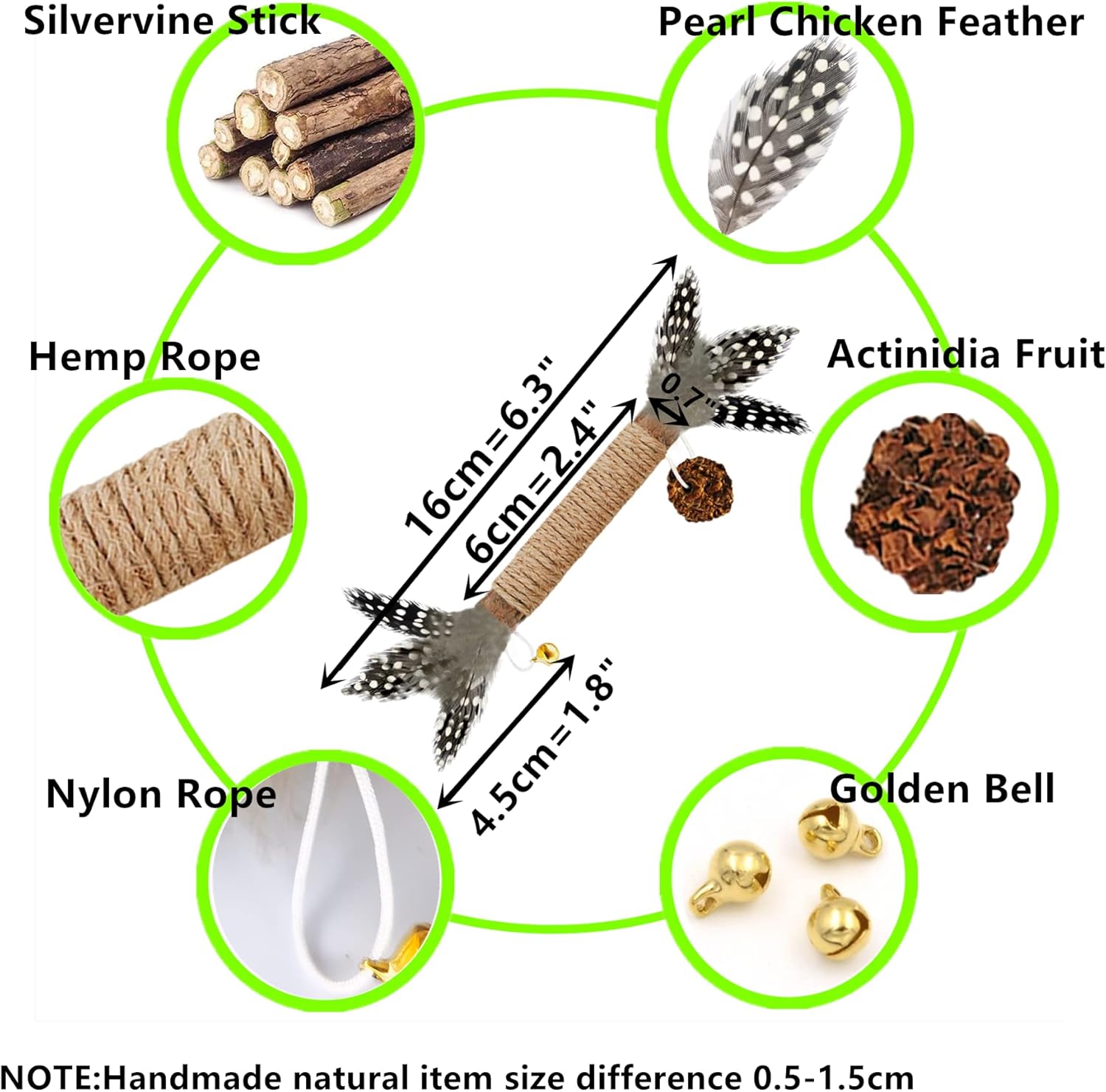 - 1.[Upgraded 5 in 1 Cat Toys]:Cat chew toy for kitten is designed for cat health problem by“5 semsings”.SMELL of twisted catnip hemp rope; VISION of natural handmade silvervine stick for cat; TOUCH of real & nice chicken feather; TASTE of organic matatabi fruit; HEARING of kitty swayed golden bell. Cat feather toy can prevent various problems:oral cavity, indigestion,trichomadesis, excessive obesity and pressure. You & your cat need cat teaser toy badly!