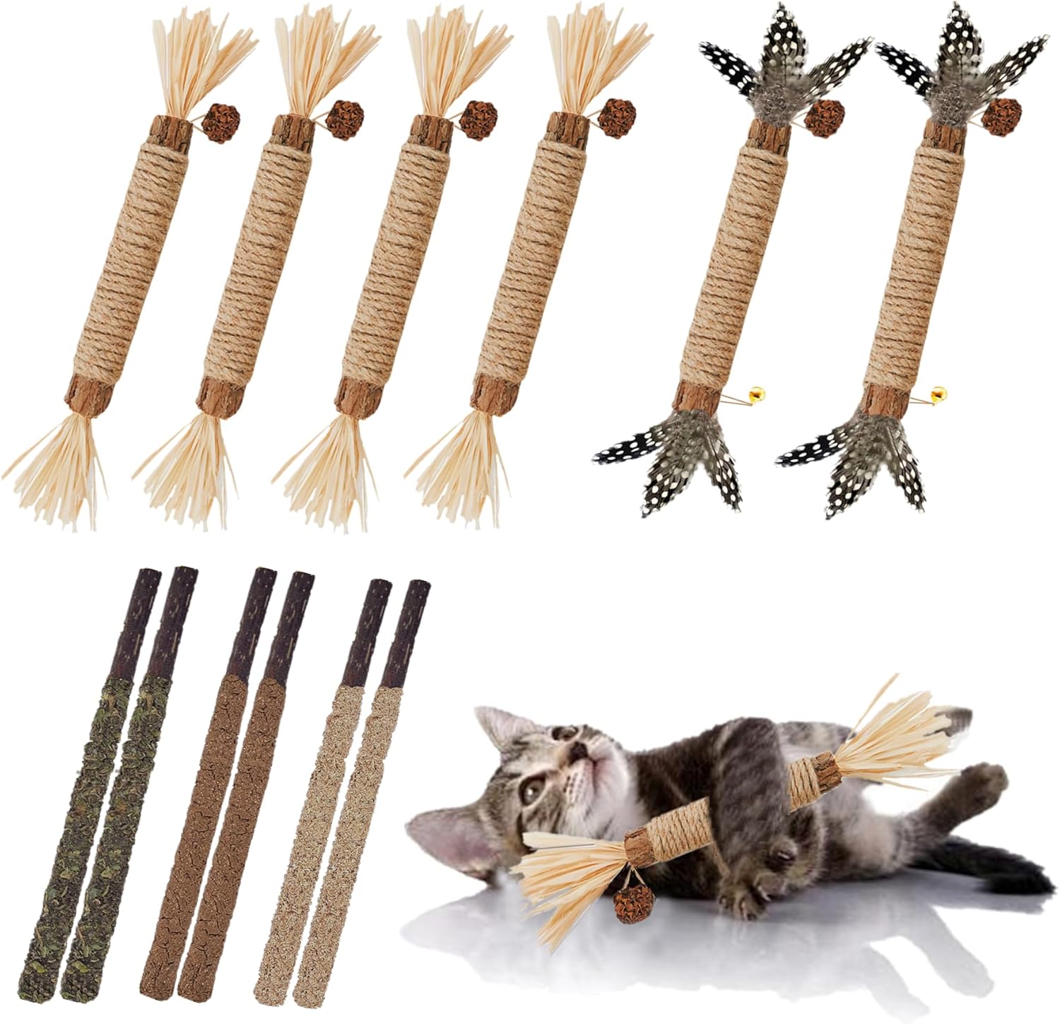 - 3.[Cat Teaser Toy with Feather]:This kitten treats for indoor kitten contains exciting durable string which makes cat chew toys for aggressive chewers more resistant to bites, dried & strong silvervine wood stick, cute kitten bell, lickable actinidia fruit. To increase the cat's interest in cat dental toy, we have added beautiful feather to teasing cat.Real fur will make cat very excited & playful, release the pressure in the process of playing & make the mood better.