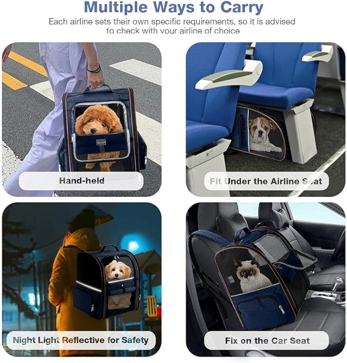 - EXPANDABLE & COLLAPSIBLE: This pet carrier backpack with an expandable back allows your pet to move around more comfortably and reduces the anxiety. And the carrier can collapse flat when not in use. Measures 14.17x12.59x17.32 inch, easily fits most small/medium-sized pets, weighing up to 18 lbs. Each airline sets their own specific requirements, so it is advised to check with your airline of choice