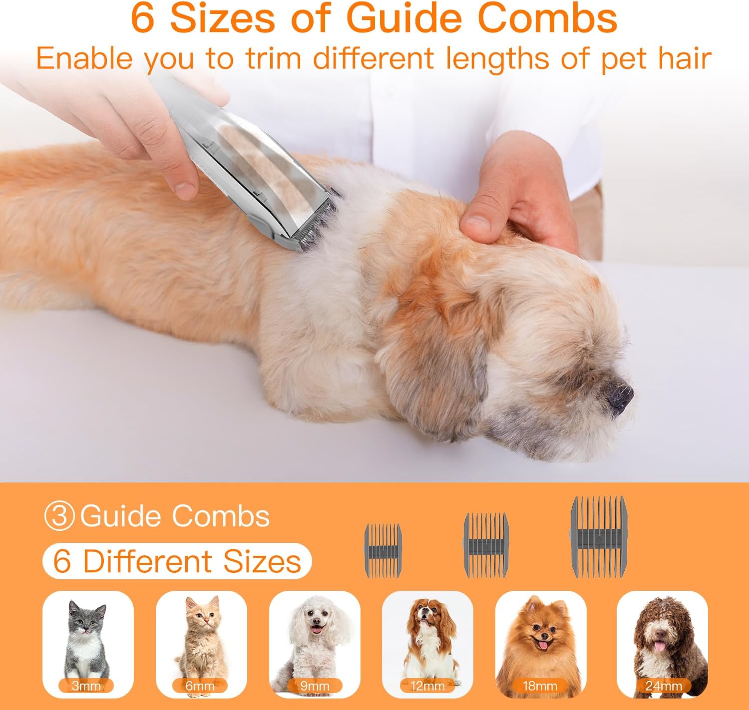 - Versatile Electric Clippers with Multiple Sizes - Our clipper comes with four guide combs in sizes 3mm, 6mm, 9mm, 12mm, 18mm, and 24mm, offering precise trimming for various fur types. Whether your pet has extra-long hair, medium-long hair, or curly hair, these adjustable guide combs ensure a tailored and professional grooming experience.