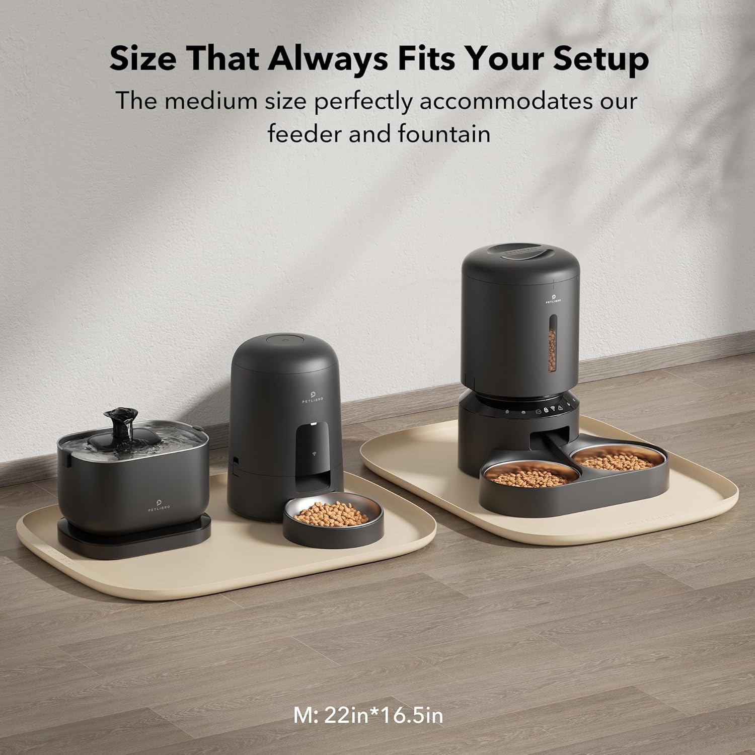 - A Perfect Fit For Every Pet And Bowl: With a range of sizes and colors to choose from, the Cove food mat is a versatile addition to any pet feeding station. The small mat measures 17.7 × 12 in, while the medium option measures 22 × 16.5 in. Not only do they fit perfectly with the PETLIBRO range of smart feeders and fountains, but they're compatible with various bowls and accessories too.