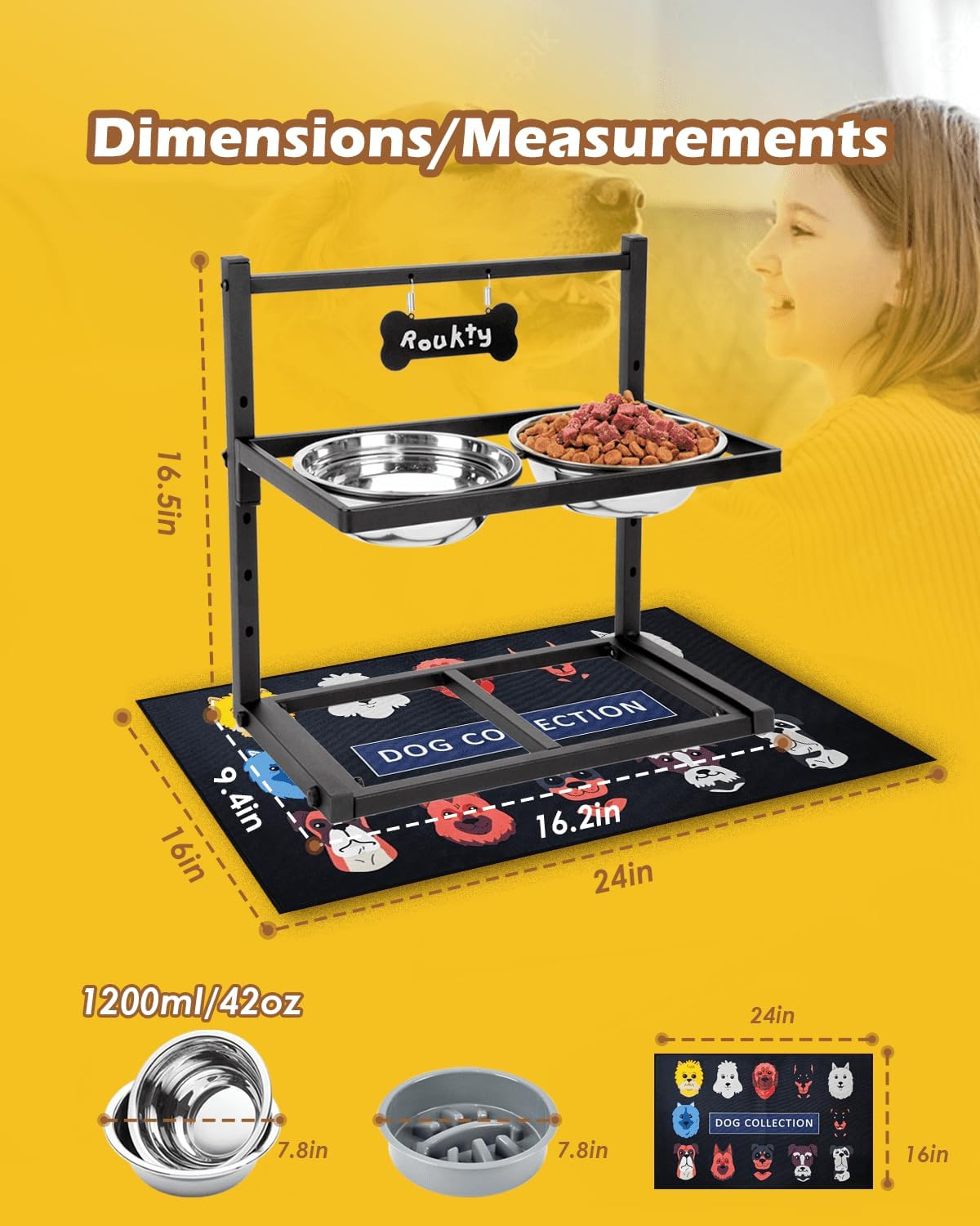Elevated Dog Bowls with Slow Feeder & Mat, Adjusable Height Raised Dog Bowl Stand with 2 Stainless Steel 1200ML Bowl