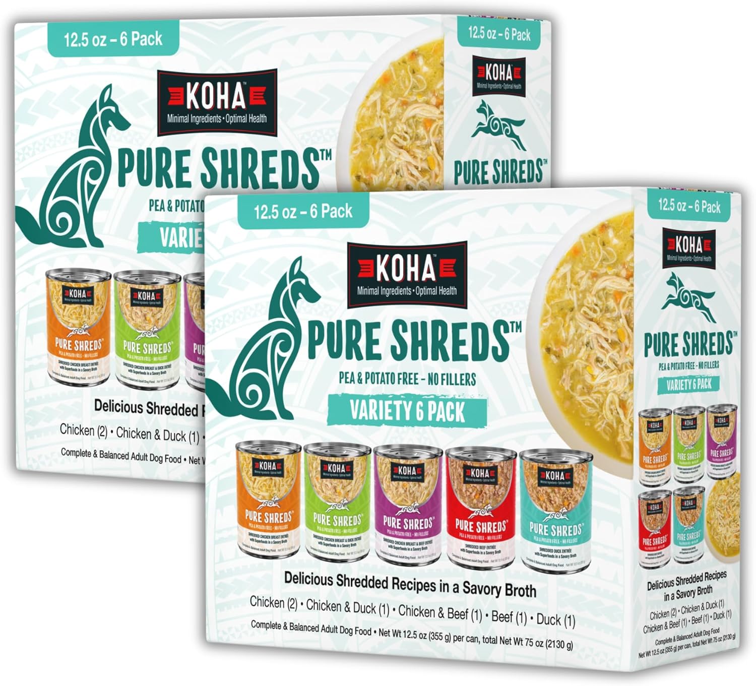 KOHA Pure Shreds Dog Food, 5 Flavors Variety Pack, Wet Food for Picky Eaters, Low Fat, High Protein, 12.5oz Cans, 2 x 6 Pack Cans