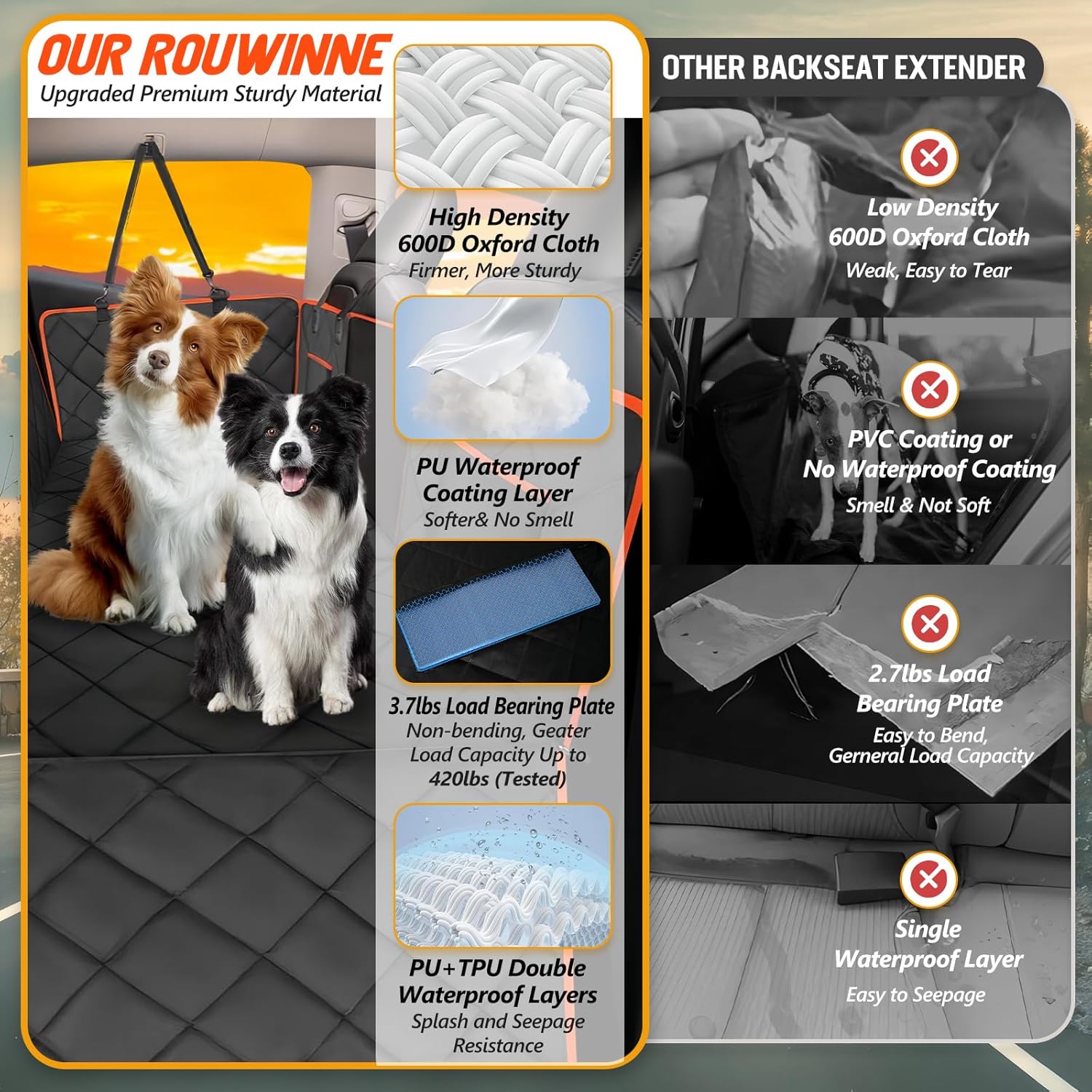 - 【100% Waterproof & Effortlessly Clean】Crafted with high-quality pu and oxford cloth, ROUWINNE car dog cover back seat extender is specially designed with high level waterproof car back seat cover for dogs and easy-to-clean materials, taking the stress out of any mess. No more worrying about dirt, fur, or slobber ruining your car seats.