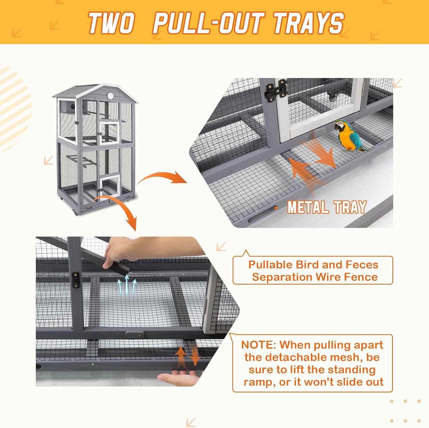 65in Outdoor Bird Aviary with Wheels,Wooden Bird Cage Indoor Finches Cage Flight cage Wire Mesh,Easy Clean Tray Perches Nest Feeder