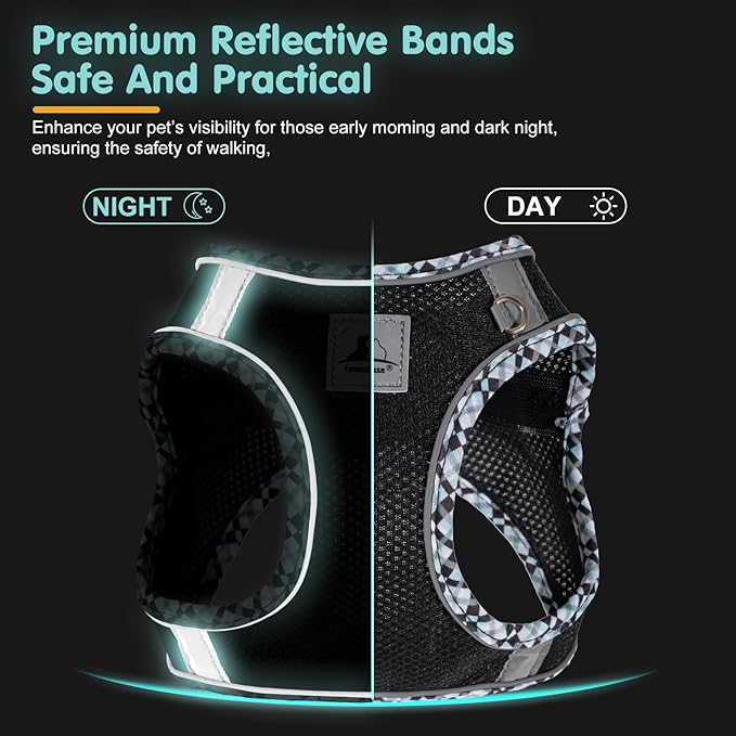 - Reflective & Adjustable Puppy Dog Harness; Super 360°highly reflective strips is designed to reflect ambient light under extreme low light conditions, it can provide maximum visibility when dogs walking at night. Our No-Choke dog harness can distribute the pulling pressure evenly to the dog’s body and protect dog's trachea and throat from pulling and choking.