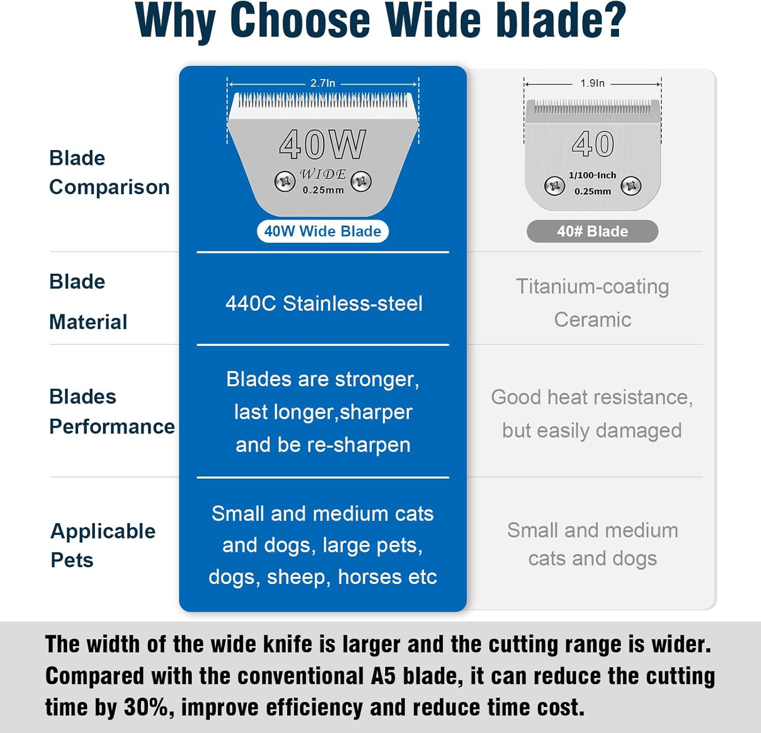 40W Wide Pet Dog Grooming Detachable Blades,Compatible with Andis,Oster A5,Wahl KM10 Clippers,Cut Length 1/100"(0.25mm) for Larger Animals
