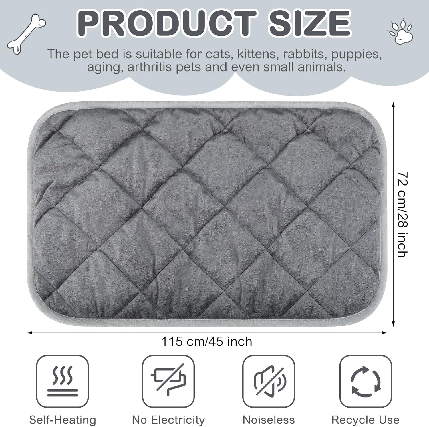 - Product Information: you will receive 4 self heating pet mats, which size is measured about 45 x 28 inch/ 115 x 72 cm; The pet bed is suitable for cats, feral cats, kittens, rabbits, puppies, aging, arthritis pets and even small animals, good to use on sofa, floor, pet beds, cat perches in pet cage, carriers, crate, kennel, playpen, and outdoor house, condos, shelter, enclosures, colony and more to rescue animals