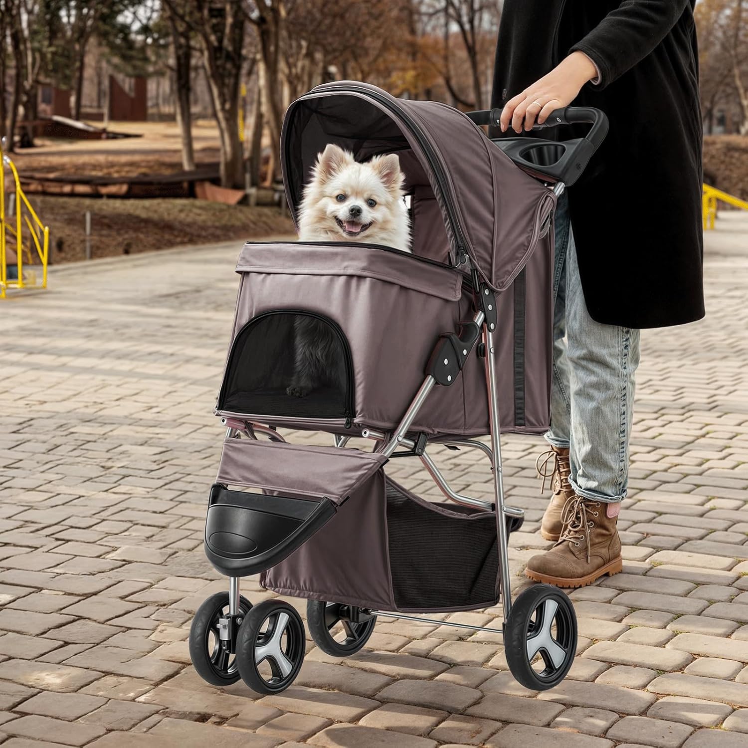 MoNiBloom Foldable Dog Strollers for Small Dogs with Weather Cover, 3 Wheels Pet Strolling Cart for Dogs and Cats with Storage Basket and Cup Holder, Breathable and Visible Mesh for All-Season, Coffee