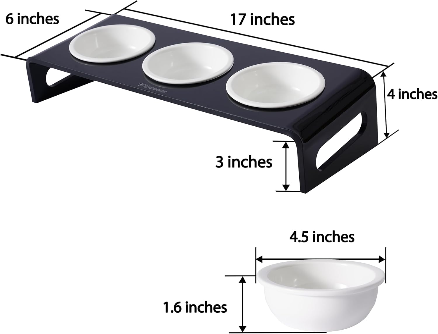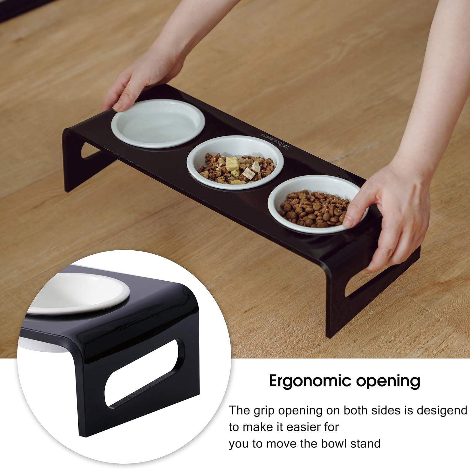 - Three Bowls are perfect for dry food, wet food and water! The pet bowl riser is made of 0.32 inch/8mm thick high quality acrylic material that will not oxidize or rust over time, the smooth surface allows you to keep it clean by simply wiping it with a damp cloth, and the one-piece molding is sturdy and durable without assembly, and it is very convenient to use when you open the package.